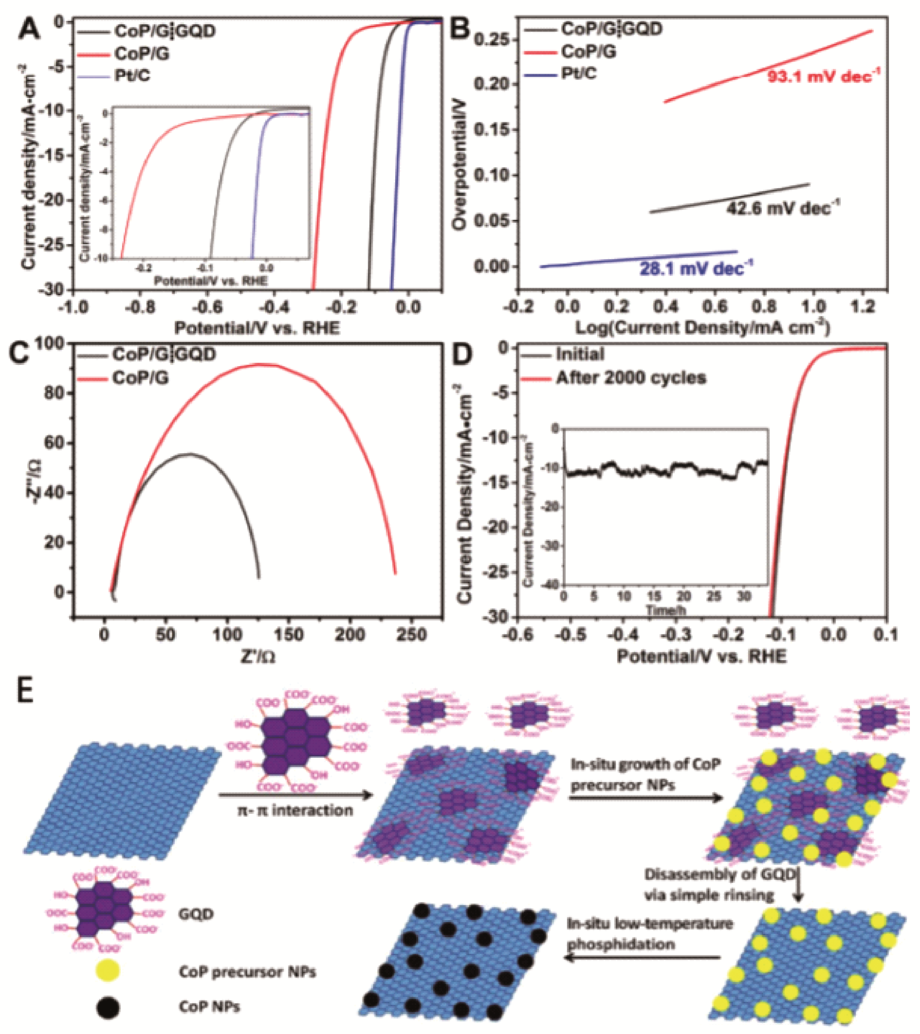 图6 CoP/G⁞GQD、CoP/G和商业Pt/C的线性伏安(LSV)曲线(A)和Tafel图(B);(C)CoP/G⁞GQD和CoP/G在200 mV过电位下在106到1 Hz的频率范围内测量的奈奎斯特图;(D)CoP/G⁞GQD在-0.17~+0.01 V之间2 mV/s的扫描速率下,经过100 mV/s的2000个CV循环之前和之后的LSV曲线,插图:在91.3 mV的过电位下CoP/G的稳定性测试;(E)CoP/G⁞GQD的合成过程示意图[77]Fig. 6 LSV curves (A) and Tafel plots (B) of CoP/G⁞GQD, CoP/G, and commercial Pt/C; (C) Nyquist plots of CoP/G⁞GQD and CoP/G measured at an overpotential of 200 mV in a frequency range from 106 to 1 Hz; (D) LSV curves of CoP/G⁞GQD at a scan rate of 2 mV/s before and after 2000 CV cycles at a scan rate of 100 mV/s between -0.17 and +0.01 V. Inset: time dependence of the current density of CoP/ G⁞GQD at an overpotential of 91.3 mV; (E) schematic illustration of the synthesis process of CoP/G⁞GQD[77] |