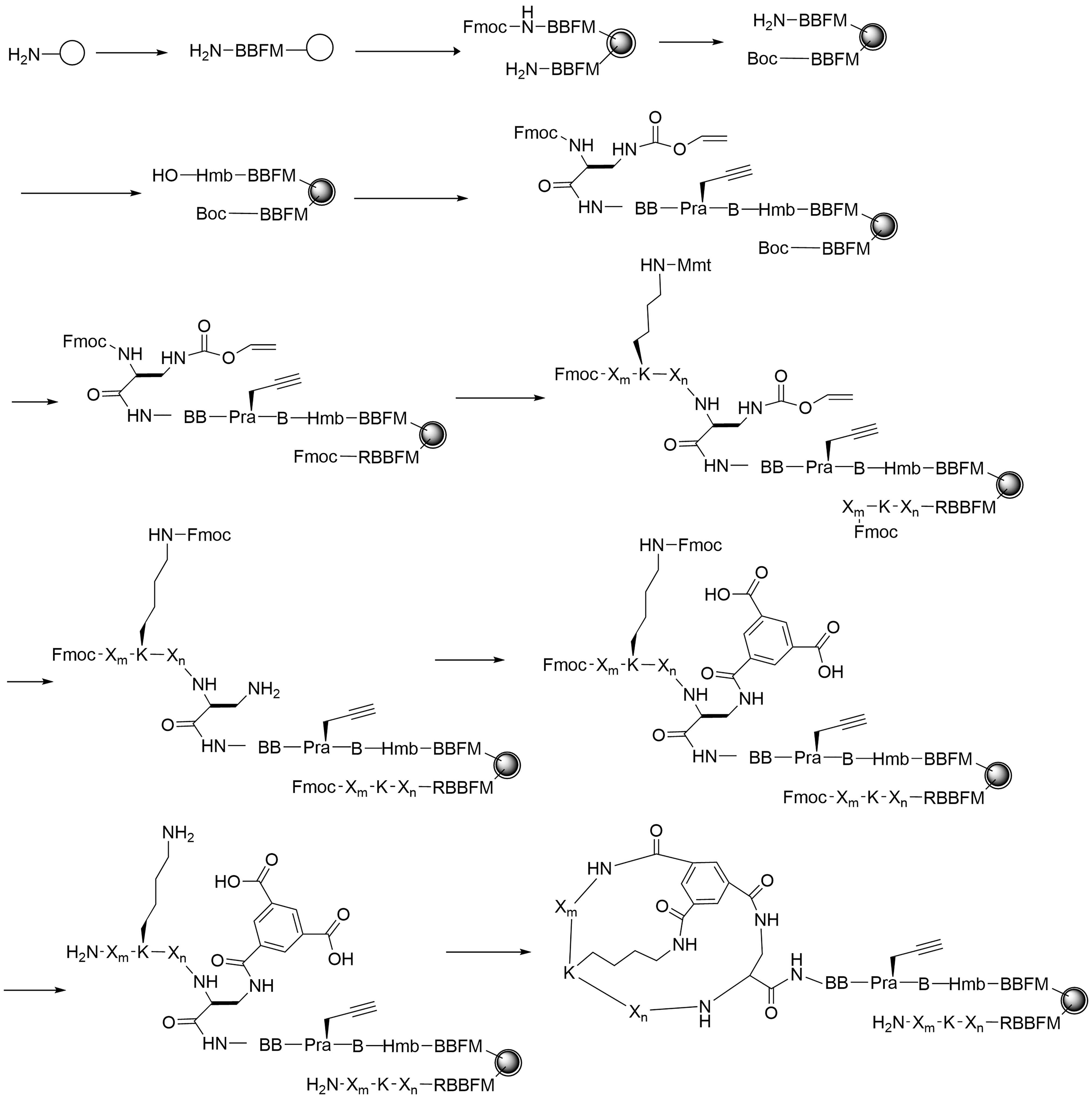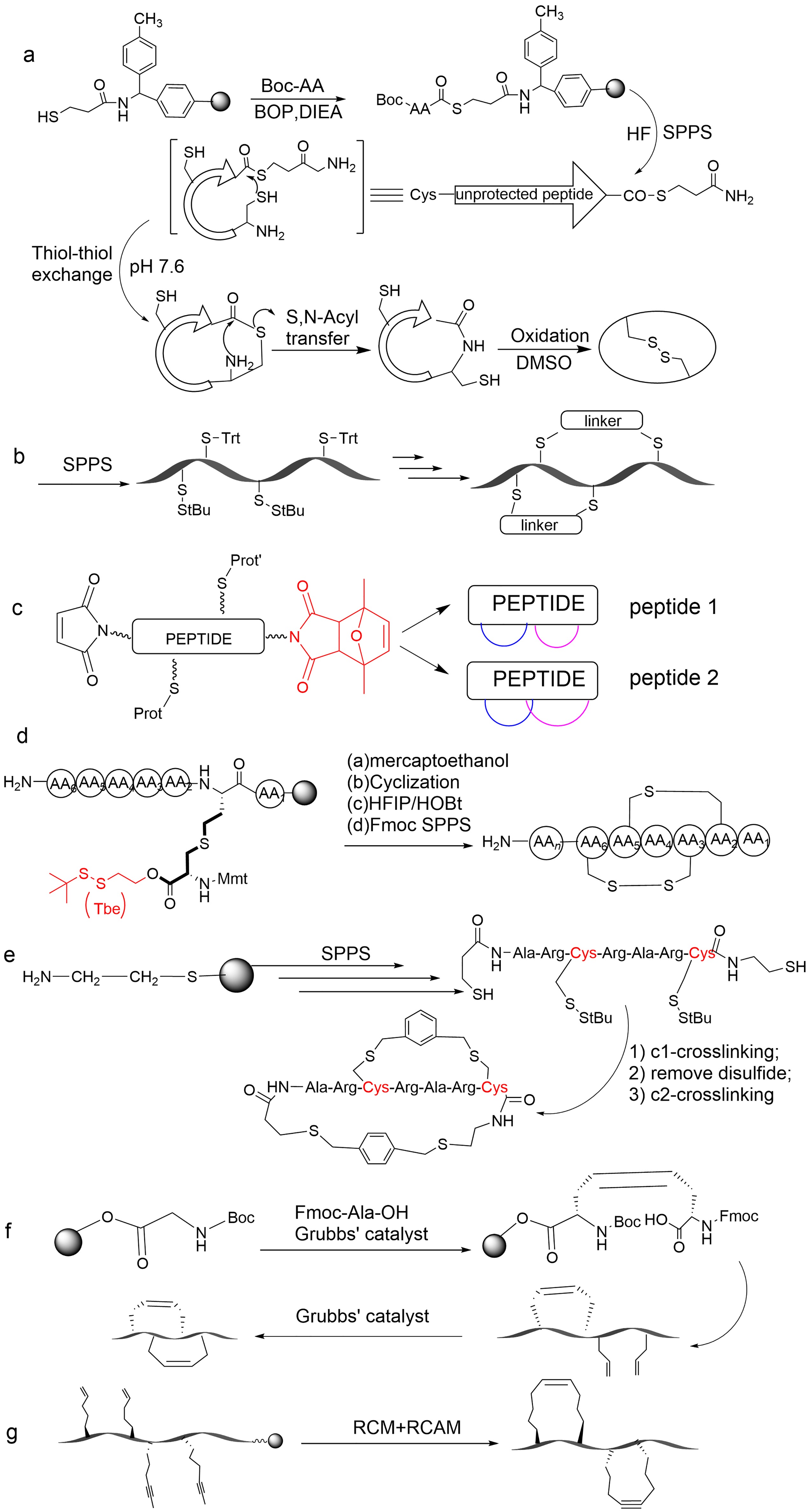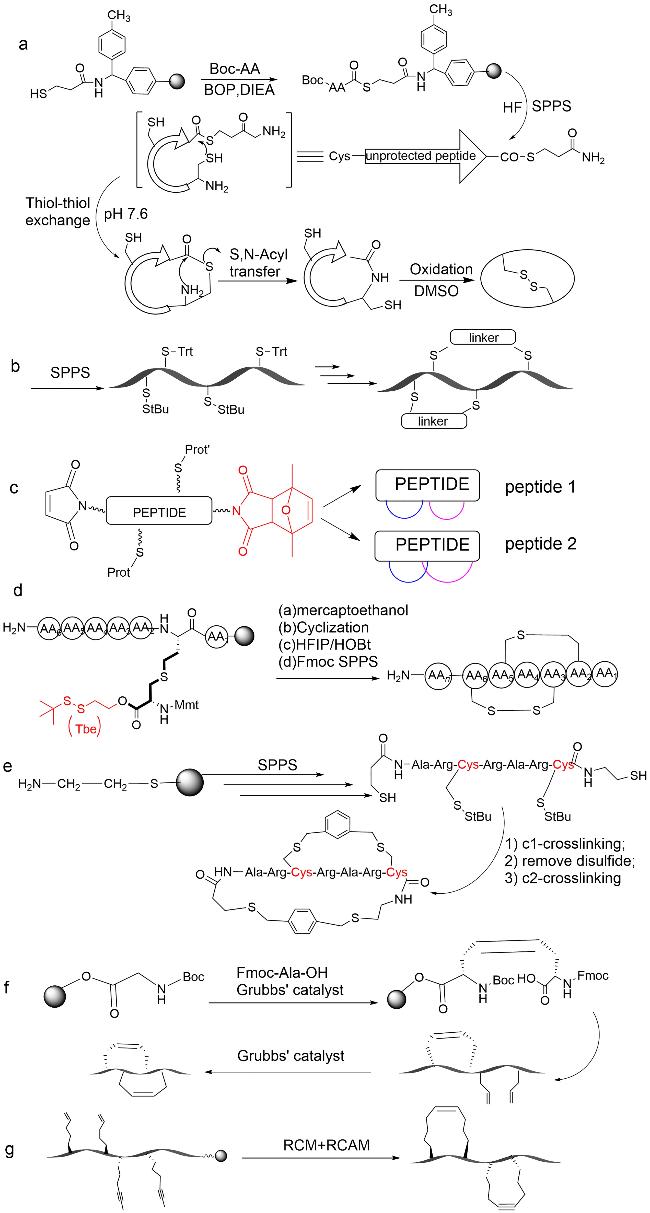 图式4 双环肽合成方法示例(a:通过树脂上分子内硫酯连接和树脂外二甲基亚砜介导的二硫键形成的合成方法;b:Trt-StBu策略用于硫醚双环肽的合成;c:Michael加成法合成双环肽;d:3个正交保护基团(Fmoc、Mtt和Tbe)的二氨基二酸法;e:头尾相连构建双环肽;f:烯烃复分解法;g:烯烃、炔烃复分解法相结合)Scheme 4 Summary of bicyclic peptide synthesis methods(a: Synthesis via intramolecular thioester linkage on the resin and dimethyl sulfoxide mediated disulfide formation outside the resin; b: Trt-StBu strategy for the synthesis of thioether bicyclic peptides; c: Michael addition for the synthesis of bicyclic peptides; d: diaminodicarboxylic acid method of three orthogonal protecting groups(Fmoc,Mtt,and Tbe); e: head-to-tail linkage to construct a bicyclic peptide; and f: alkyne reductomerisation method; g: combination of olefinic and alkynic complexation.) |