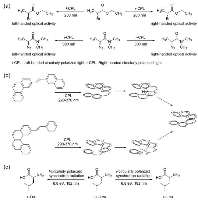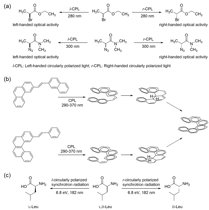 图1 (a) 圆偏振光选择性降解某一对映体[25-26];(b) 首例不对称光合成反应[27];(c) 圆偏振光选择性降解消旋亮氨酸[28],l-/r-CPL,左/右旋圆偏振光Fig.1 (a) Selective degradation of one enantiomer by circularly polarized light[25-26]; (b) first asymmetric photosynthesis reaction; (c) selective degradation of racemic leucine by circularly polarized light[27]. l-/r-CPL, left-/right-handed circularly polarized light[28] |