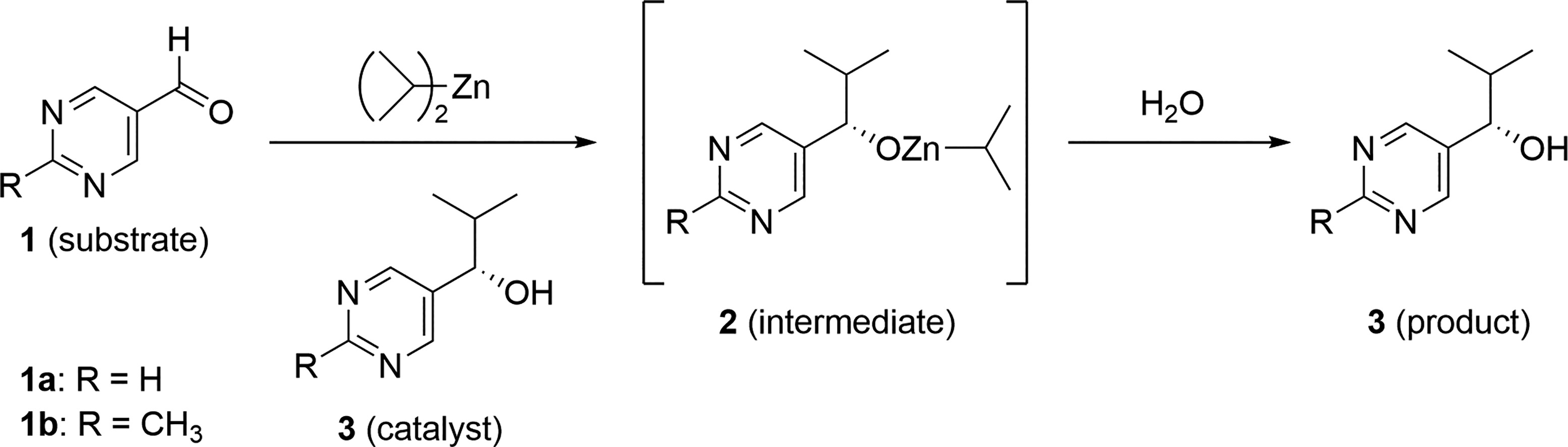 图3 典型的硤合反应[87]。嘧啶-5-甲醛1和二异丙基锌在低光学纯度嘧啶醇3的催化下经中间体2生成高光学纯度的3,嘧啶醇3再作为此反应的催化剂Fig.3 A typical Soai reaction[87]. Pyrimidine-5-carbaldehyde 1 and diisopropylzinc react to form the intermediate 2, which is catalyzed by low optical purity pyrimidine alcohol 3. This process produces high optical purity 3, and the pyrimidine alcohol 3 then serves as the catalyst for this reaction |