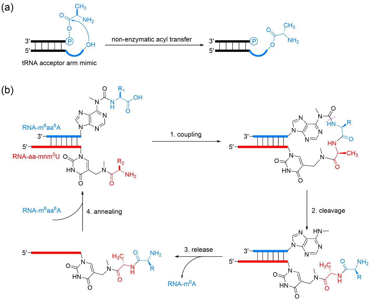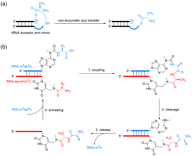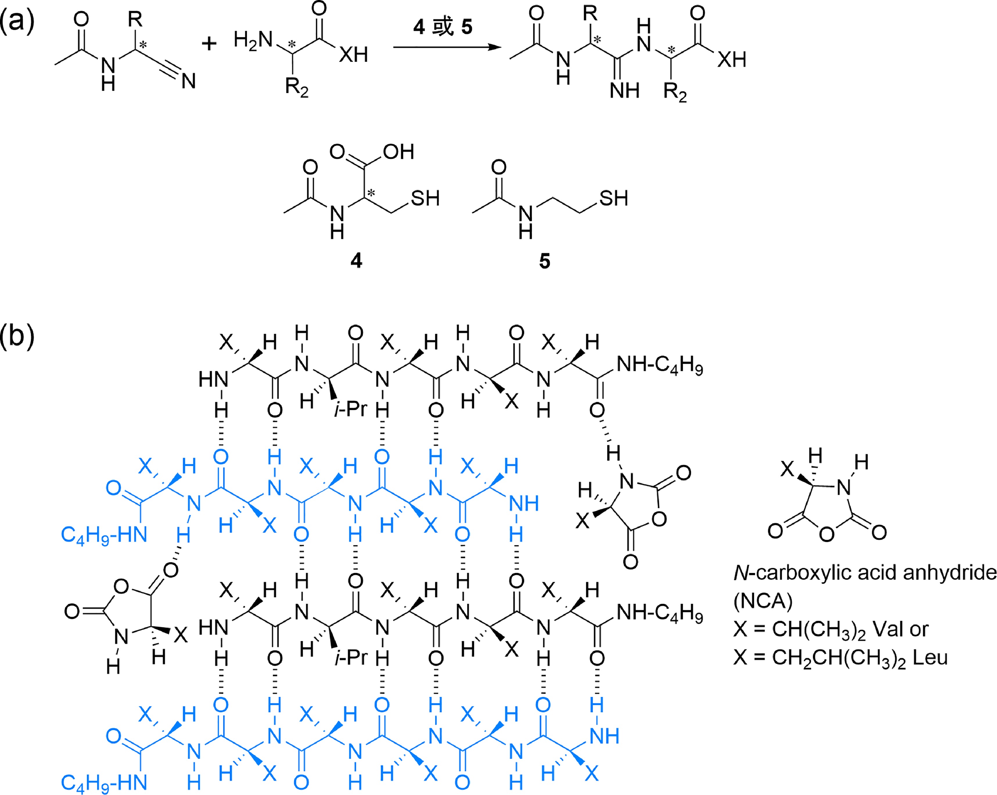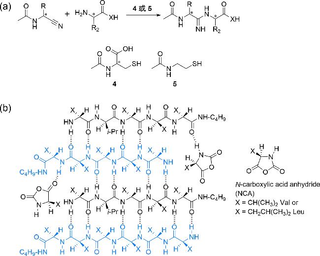 图4 (a) 使用N-乙酰半胱氨酸4或N-(2-巯基乙基)乙酰胺5催化形成单一手性二肽[100];(b) 使用消旋的缬氨酸或亮氨酸的N-羧基环内酸酐形成单一手性反平行β折叠[105]Fig. 4 (a) Formation of homochiral dipeptide catalyzed by N-acetylcysteine 4 or N-(2-mercaptoethyl) acetamido 5[100]; (b) formation of homochiral antiparallel β sheet using racemic valine or leucine N-carboxylic acid anhydride[105] |