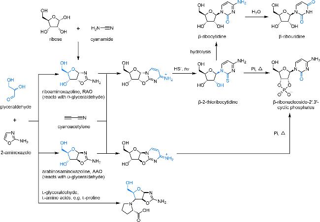 图6 嘧啶核苷酸前生命合成路线[57-58]。2-氨基噁唑啉与消旋甘油醛反应生成RAO、AAO等八种中间体,其中与L-甘油醛反应得到的产物可以继续与L-氨基酸反应,生成三组分中间体,与D-甘油醛反应得到的产物中只有RAO可以通过CISS效应富集,继而经由硫化、光照、水解、磷酸化生成嘧啶核苷、核苷酸Fig. 6 Prebiotic synthesis of pyrimidine nucleotides[57-58]. 2-Aminooxazoline reacts with racemic glyceraldehyde to yield RAO, AAO, and six other intermediates. Among these, the product obtained from the reaction with L-glyceraldehyde can further react with L-amino acids to form three-component intermediates. The product obtained from the reaction with D-glyceraldehyde contains only RAO, which can be enriched via the CISS effect. Subsequently, it undergoes sulfidation, UV irradiation, hydrolysis, and phosphorylation to produce pyrimidine nucleosides and nucleotides |