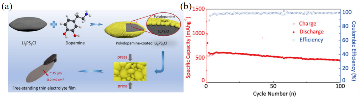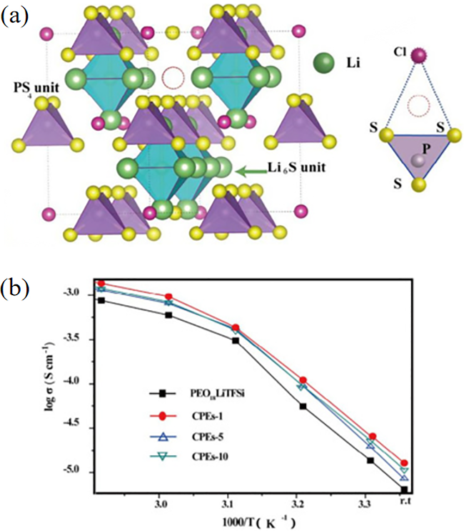 All-solid-state batteries have the characteristics of high energy density, long cycle lifeand high safety, which is the development direction of the next generation of electrochemical energy storage. Solid-state electrolytes are the core components of all-solid-state batteries, and sulfide electrolytes have attracted extensive attention due to their advantages of high ionic conductivity and good mechanical ductility. As one of the most studied sulfide electrolytes in recent years, lithium-phosphorus-sulfur-chloride sulfide (LPSC) has high ionic conductivity and relatively low cost, but its practical application is limited by shortcomings such as poor stability and poor compatibility of positive and negative electrode materials. The composite solid-state electrolyte has good electrochemical and mechanical properties, and the composite solid-state electrolyte is prepared by modifying the LPSC with polymers, aiming to improve the interfacial compatibility and electrochemical stability of the LPSC. In this paper, the basic composition, recombination mode, modification strategy and ion transport mechanism of LPSC composite solid electrolyte are reviewed, and the future research direction and application prospect of LPSC composite electrolyte are prospected.