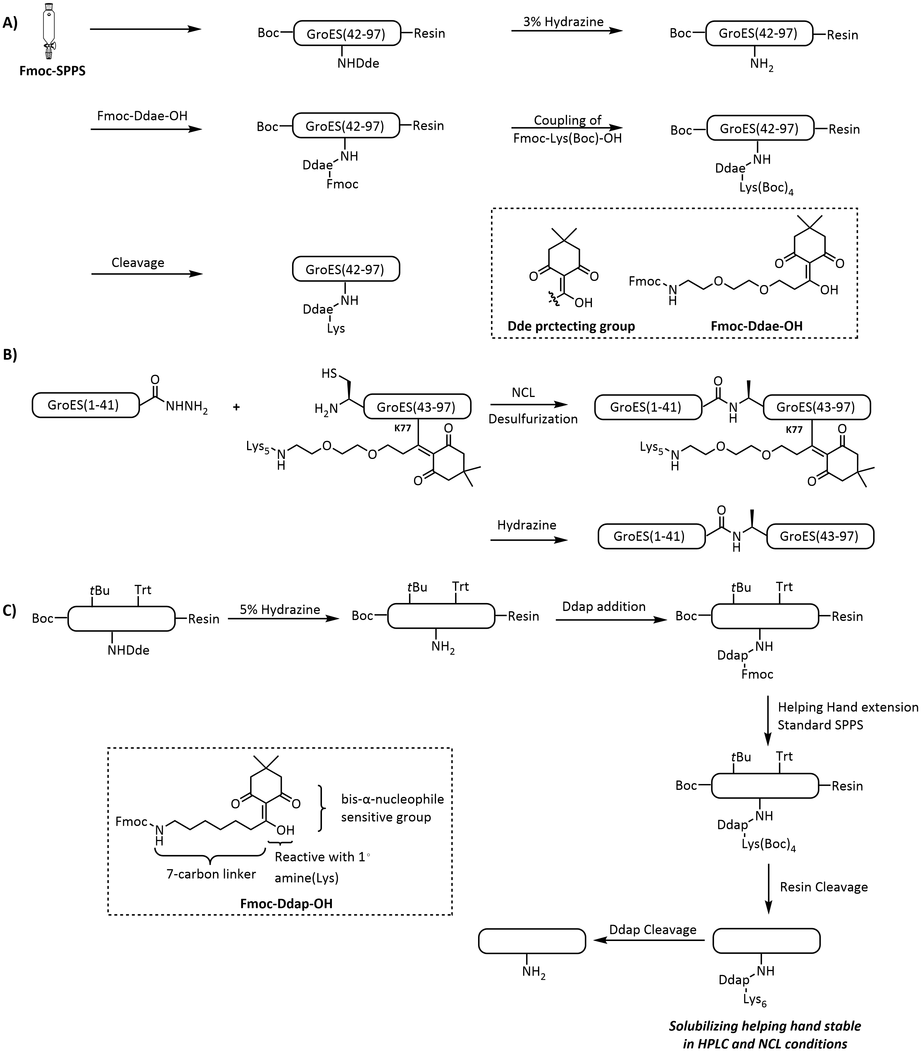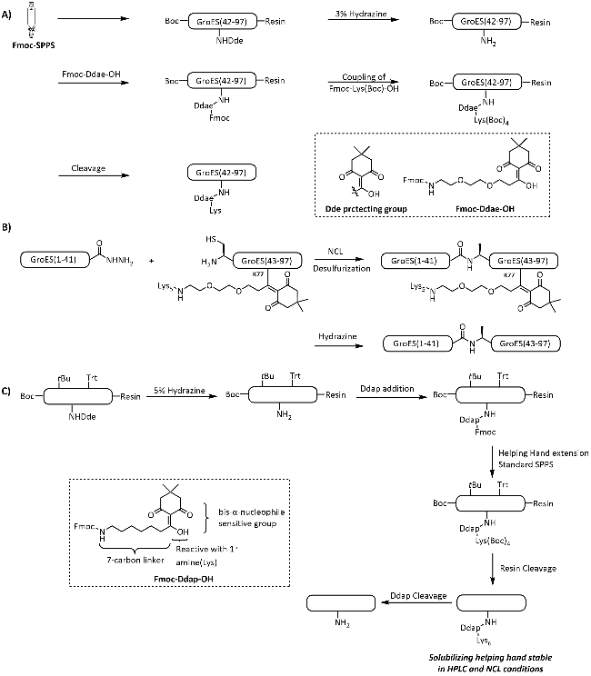 图式10 通过Ddae/Ddap连接体引入助溶标签以合成目标蛋白[111-112]: (A) Ddae连接体的引入策略;(B) 基于酰肼的自然化学连接合成GroES蛋白; (C) Ddap连接体的引入策略Scheme 10 Introduction of solubilizing tag via Ddae/Ddap linker for synthesis of target proteins[111-112]. (A) Strategies for the introduction of Ddae linker to peptide fragments; (B) Hydrazine-based native chemical ligation for synthesis of GroES; (C) Strategies for the introduction of Ddap linker to peptide fragments |