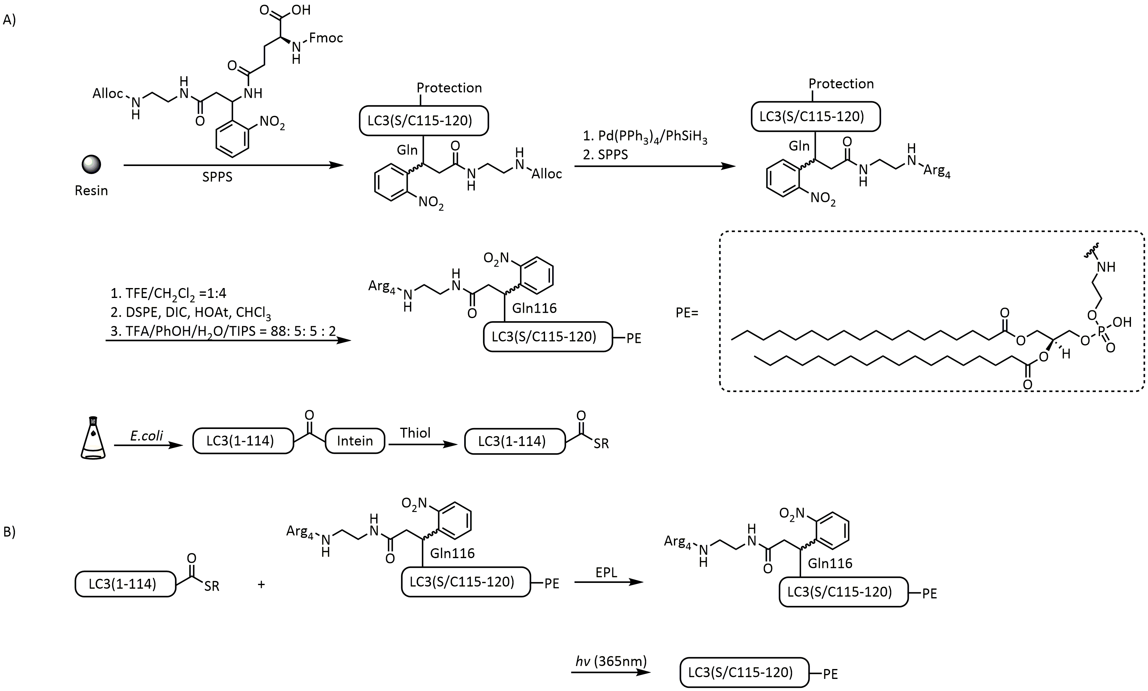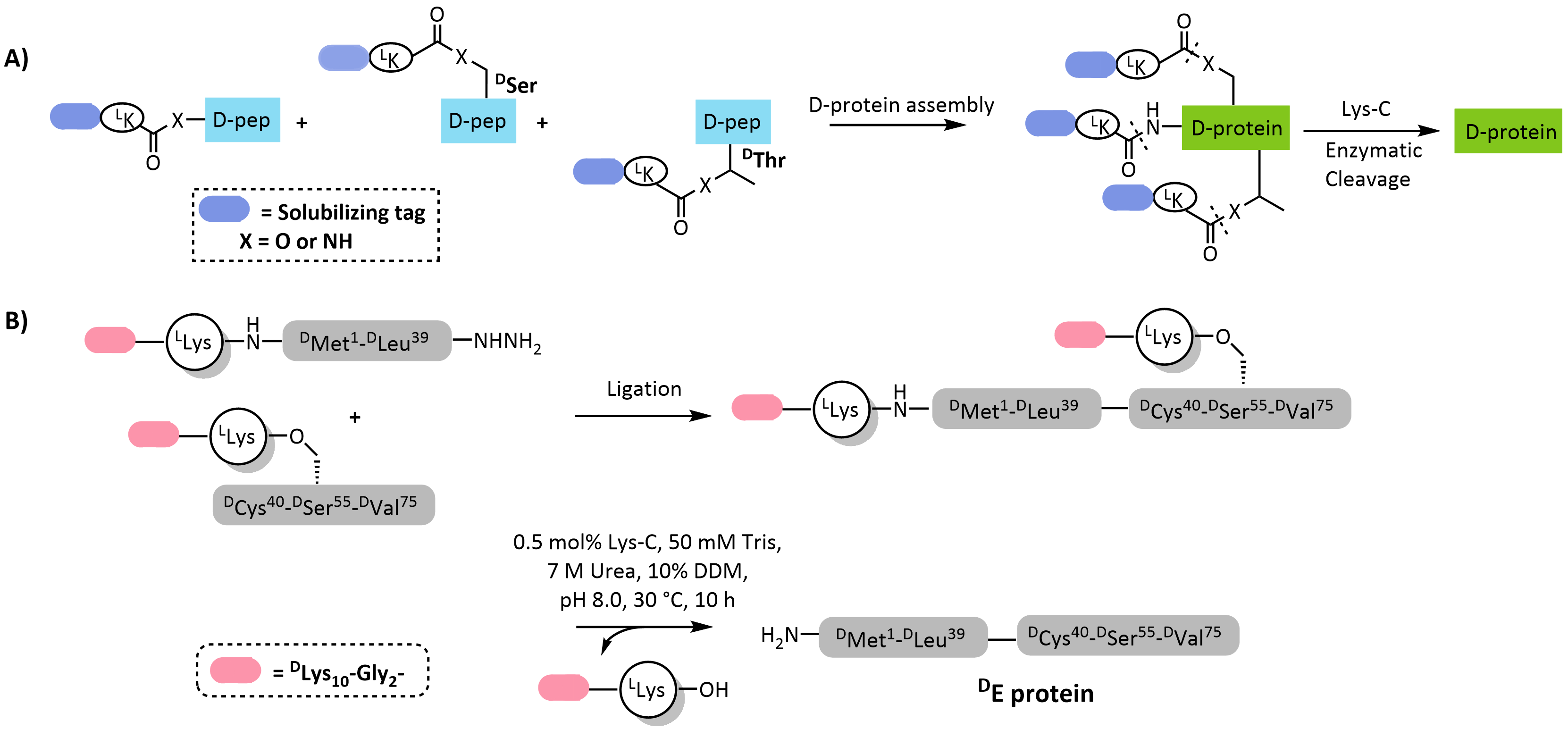 图式11 L-Lys连接的助溶标签用于合成DE蛋白[113]: (A) L-Lys连接的助溶标签的引入策略;(B) 基于酰肼的自然化学连接合成DE蛋白Scheme 11 Chemical synthesis of DE protein via the L-Lys linked solubilizing tag[113]. (A) Strategies for the introduction of L-Lys linked solubilizing tag; (B) Hydrazine-based native chemical ligation for synthesis of DE protein |