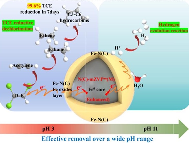 | Ni-nZVI/BC | H* | EIS, CV, EPR, Methanol Quenching Experiment | TCE | pH = 7.0, T = 25 ℃, 20 mg/L TCE, 1.0 g/L Ni-nZVI/BC | 17 |