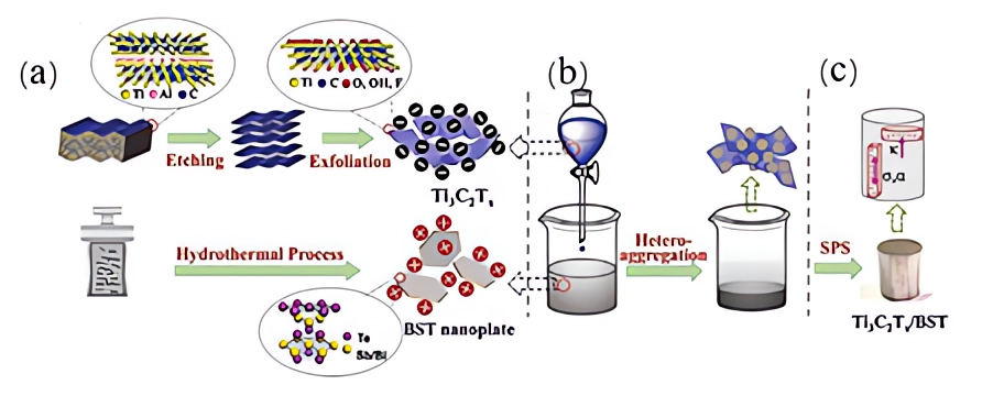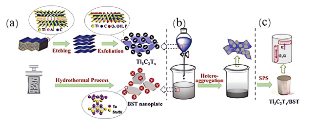 图9 (a)Ti3C2Tx纳米片和BST纳米片制备示意图;(b)制备Ti3C2Tx/BST复合粉末的自组装工艺;(c)Ti3C2Tx/BST复合材料的致密化及不同性能的试样说明[22]Fig.9 (a) Schematic diagram of the preparation of Ti3C2Tx nanosheets and BST nanosheets; (b) Self-assembly process for preparing Ti3C2Tx/BST composite powder; (c) Densification of Ti3C2Tx/BST composite materials and description of samples with different properties. Reprinted with permission from [22], Copyright 2020 Advanced Energy Materials |