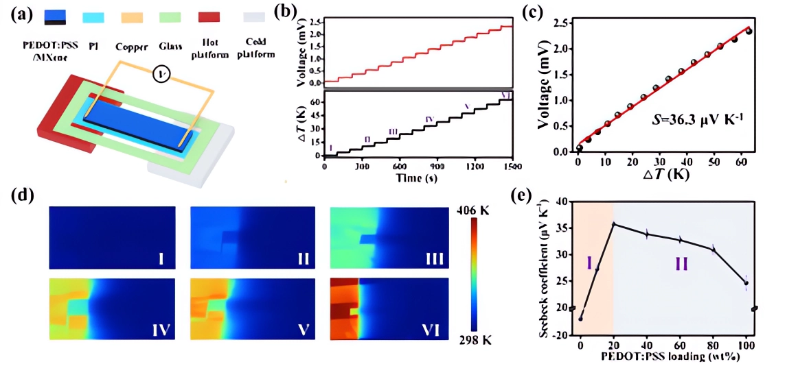 图6 (a)基于PEDOT:PSS/MXene薄膜的热电性能测量装置示意图;(b)PEDOT:PSS/MXene薄膜在热平台加热过程中不同阶段的输出电压和△T;(c)PEDOT:PSS/MXene薄膜的输出电压随△T的变化;(d) PEDOT:PSS/MXene薄膜在热平台加热过程中不同阶段的红外图像;(e)PEDOT:PSS/MXene薄膜的塞贝克系数随PEDOT:PSS加载百分比的变化[48]Fig.6 (a) Schematic diagram of the thermoelectric performance measurement device for PEDOT:PSS/MXene films; (b) Output voltage and △T at different stages of heating process of PEDOT:PSS/MXene films on a thermal platform; (c) Output voltage of PEDOT:PSS/MXene films as a function of △T; (d) Infrared images of PEDOT:PSS/MXene films at different stages of heating process on a thermal platform; (e) Seebeck coefficient of PEDOT:PSS/MXene films as a function of PEDOT:PSS loading percentage. Reprinted with permission from [48], Copyright 2023 RSC Advances |
