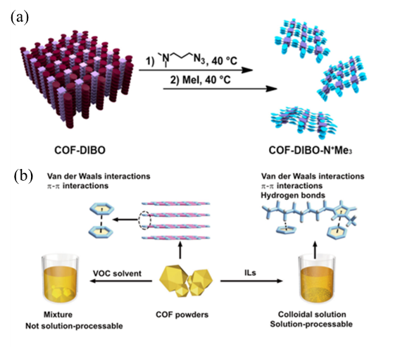 | TpHa-COF TbPa-COF TbBd-COF | 1-methyl-3-octylimidazole bromide([C8mim][Br]) | Ionic liquid assisted COF dispersion | 15 |