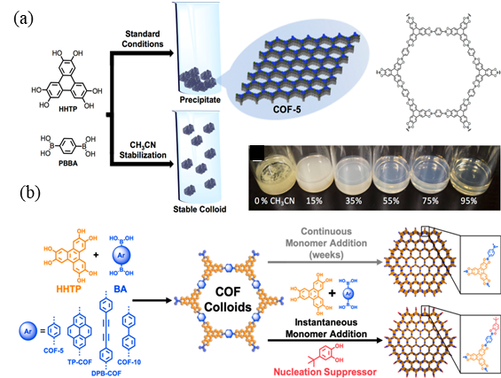 | COF-5 | CH3CN | CH3CN interacts directly with the boronic acid bond, weakening the attraction between crystals and thus inhibiting crystal aggregation. | 18 |