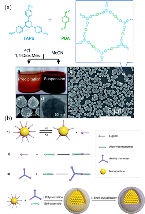| TAPB-PDA 2D COF | THF、H2O | Synchronization of nanoparticle self-assembly and imine formation between them and organic substituents in confined media | 23 |