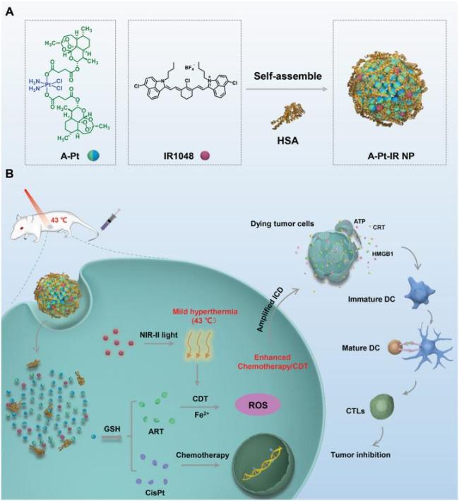 图10 NIR-II光增强化疗/CDT示意图:(A) A-Pt和IR1048的化学结构;(B) 静脉注射后,A-Pt-IR NP可在4T1乳腺癌小鼠模型的肿瘤部位有效蓄积,并通过内吞作用进入细胞发挥作用的示意图[82]Fig.10 Schematic diagram of NIR-II light-enhanced chemotherapy/CDT. (A) Chemical structure of A-Pt and IR1048. (B) Schematic diagram of A-Pt-IR NP that can effectively accumulate at the tumor site in a mouse model of 4T1 breast cancer after intravenous injection and enter cells through endocytosis[82] |