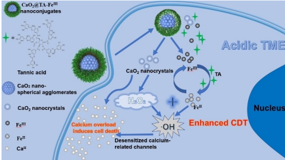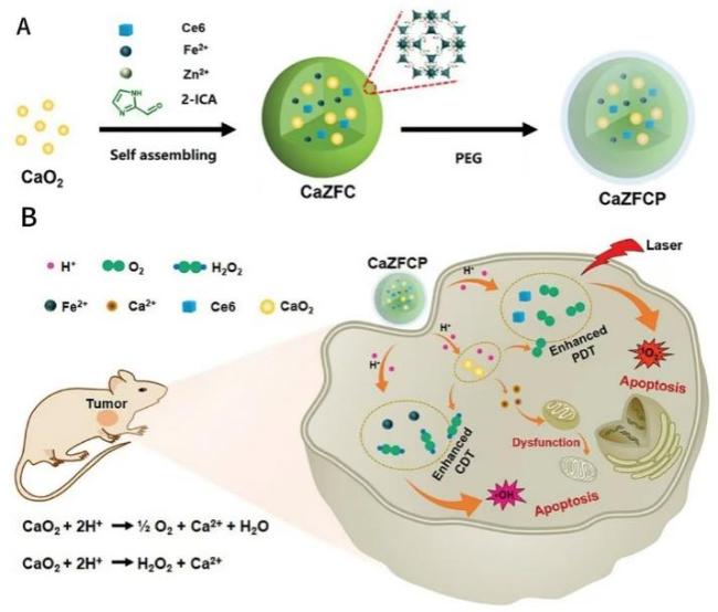 Ca | CaO2@ZIF-Fe/Ce6@PEG NPs | Breast cancer | CDT/PDT | The group treated with CaZFCP+L (combining CDT with PDT,90.4%) displayed much higher tumor growth inhibition efficacy | 65 |