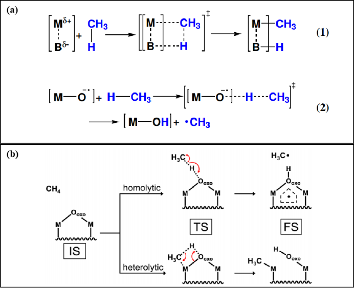 图2 (a) 碳氢键断裂的潜在途径: (1) 异裂; (2) 均裂[41]; (b) 金属氧化物纳米团簇上甲烷活化的均裂和异裂机制的初始态(IS), 过渡态(TS)和最终态(FS)[44]Fig.2 (a) Potential mechanistic pathways for C―H bond cleavage. (1) Heterolytic; (2) homolytic[41]; (b) initial state (IS), transition state (TS), and final state (FS) of homolytic and heterolytic mechanisms for methane activation over a metal oxide nanocluster[44] |
