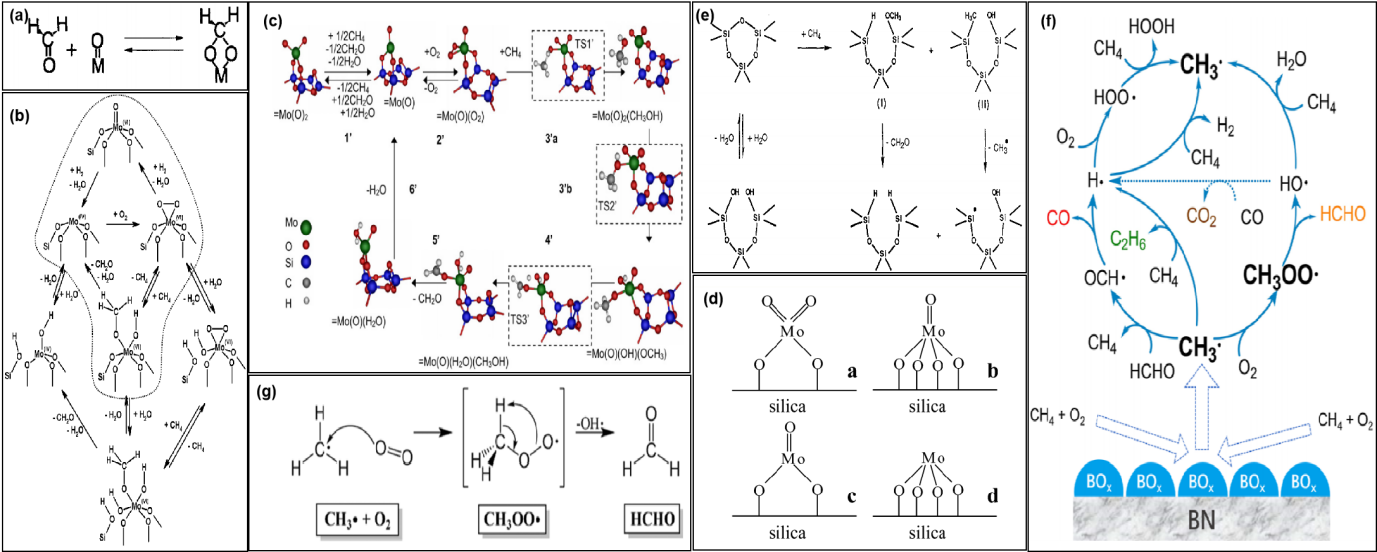 图3 (a) 二氧亚甲基(表面缩醛)中间体的可逆形成[56]; (b) 甲烷在孤立的SiO2担载的MoOx催化剂上的氧化机制, 包括由H2O存在的平行路径[61]; (c) 基于=Mo(O)2为活性中心的反应机理. 虚线框表示过渡态结构[62]; (d) 二氧化硅上孤立的钼(Ⅵ) (a, b)和钼(Ⅳ) (c, d)氧化物物种结构[65];(e) 二氧化硅表面的脱羟基化和二氧化硅催化剂上甲烷在硅氧烷缺陷位点活化生成气相甲醛和甲基自由基的反应途径[72]; (f) h-BN催化剂表面自由基引发甲烷氧化的气相反应网络[73]; (g) 气相中CH3·转化为CH3OO·和HCHO的可能途径[73]Fig.3 (a) Reversible formation of dioxymethylene (surface acetal) intermediates[56]; (b) proposed mechanism of CH4 oxidation at isolated, SiO2-supported MoOx sites, including parallel pathways enabled by the presence of H2O[61]; (c) proposed reaction mechanism based on the assumption of =Mo(O)2 as the active center. Transition state structures are enclosed within dotted lines[62]; (d) proposed structures for the isolated Mo(VI) (a, b) and Mo(IV) (c, d) oxide species on silica[65]; (e) dehydroxylation of the silica surface and the reaction pathway for methane activation at the siloxane defect site over silica catalysts to yield gas phase formaldehyde and methyl radicals[72]; (f) proposed Gas-Phase Reaction Network for Radical-Triggered Methane Oxidation over the h-BN Catalyst Surface[73]; (g) proposed Pathway of CH3· Conversion to CH3OO· and HCHO in the Gas Phase[73] |
