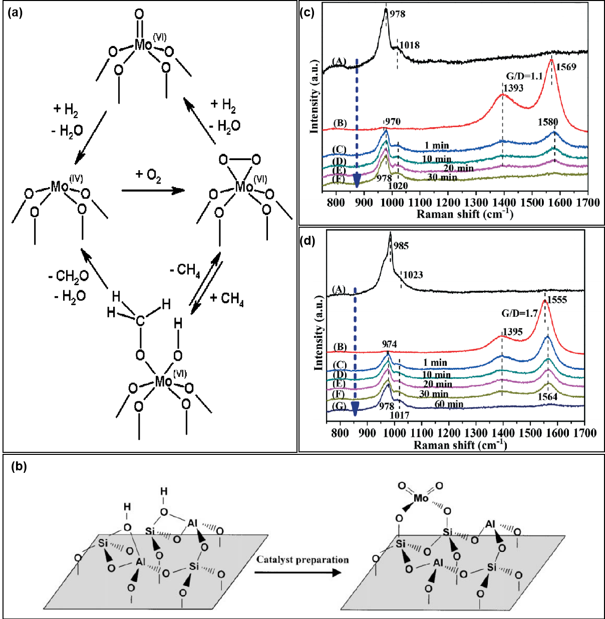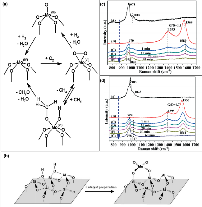 图4 (a) 甲烷在二氧化硅负载孤立的MoOx位点上的氧化机理[61]; (b) 四面体单体Mo物种与沸石Brönsted酸位的连接模型[86];脱水后的8Mo-KIT-6 (c)和4.6Mo/KIT-6 (d)催化剂在675 ℃, (A) 16.7%O2/N2的氧化流量和(B) 33.3%CH4/N2的还原流量的条件下, 在(C) 1 min、(D) 10 min、(E) 20 min、(F) 30 min、(G) 60 min的真实反应条件下进行的原位紫外拉曼光谱研究[88]Fig. 4 (a) Proposed mechanism of CH4 oxidation at isolated, SiO2-supported MoOx sites[61]; (b) model of the joining of the tetrahedral monomeric Mo species to the Brönsted acid sites of the zeolite[86]; in situ UV Raman spectra of the dehydrated 8Mo-KIT-6 (c) and 4.6Mo/KIT-6 (d) catalysts at 675 ℃ under (A) oxidizing flow of 16.7% O2/N2, and under (B) reducing flow of 33.3% CH4/N2, and exposed to real reaction condition of 33.3% CH4/16.7% O2/N2 after (C) 1 min, (D) 10 min, (E) 20 min, (F) 30 min, (G) 60 min[88] |