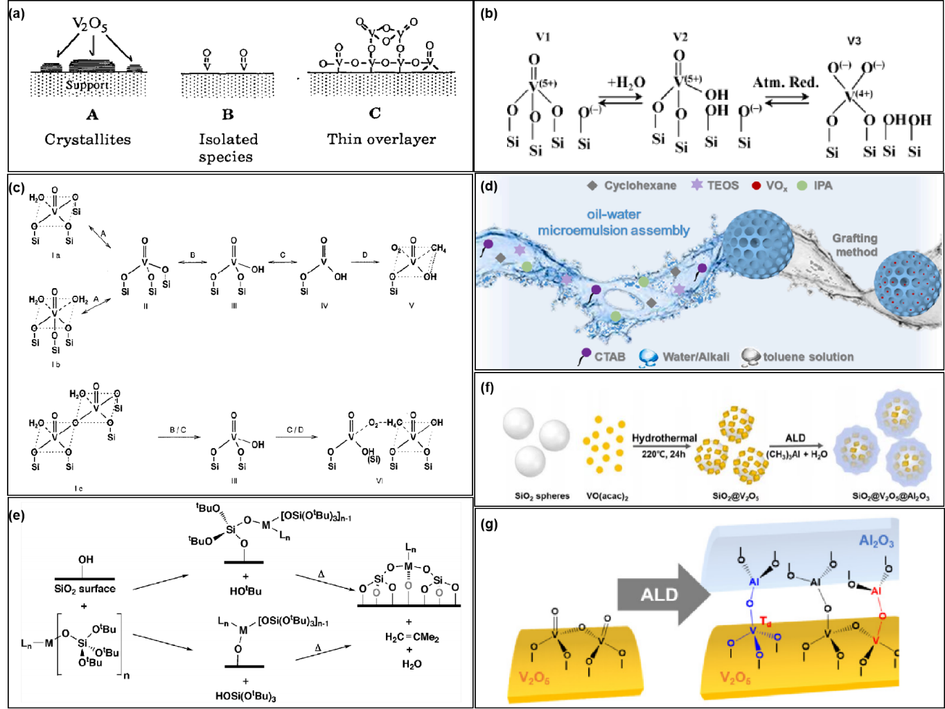 图5 (a) 载体上VOx覆盖层种类[109]; (b) 非羟基化(V1)和羟基化(V2)物种之间以及羟基化(V2)物种和活性位点(V3)之间的平衡示意图[111]; (c) VOx/MCM催化剂活性位点的形成过程及其与O2和CH4的相互作用[112]; (d) V/MSN催化剂形成机理示意图[113]; (e) 通过热裂解分子前驱体方法获得的表面负载孤立活性位点[125]; (f) SiO2@V2O5@Al2O3核壳纳米结构制备示意图[127]; (g) V2O5和Al2O3在SiO2@V2O5@Al2O3催化剂中发生反应所形成新的Td钒物种和V―O―Al键[127]Fig.5 (a) Models of vanadium oxide overlayers on supports[109]; (b) schematic equilibriums between non-hydroxylated (V1) and hydroxylated (V2) species and between hydroxylated (V2) species and proposed active sites (V3)[111]; (c) scheme of the formation of the active sites and their interaction with O2 and CH4[112]; (d) the schematic diagram for the formation mechanism of V/MSN catalysts[113]; (e) thermolytic molecular precursor approach to surface-supported, isolated active sites[125]; (f) schematic preparation of SiO2@V2O5@Al2O3 core@shell nanostructures[127]; (g) formation of new Td vanadium species and V―O―Al bonds by a reaction between V2O5 and Al2O3 in the SiO2@V2O5@Al2O3 core@shell catalyst[127] |
