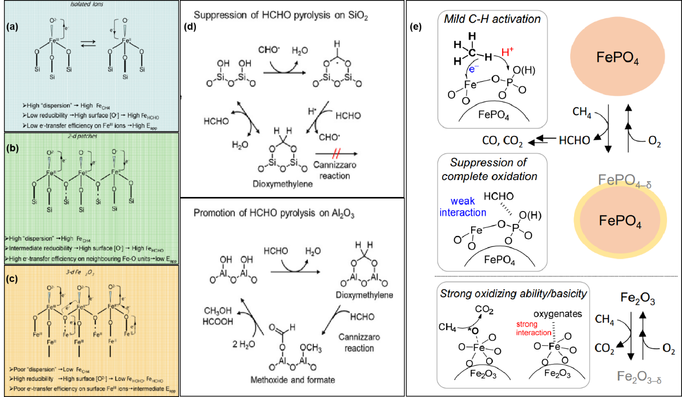 图6 (a~c) FeOx/SiO2催化剂的表面结构和对应反应模式[137]; (d) 提出了抑制甲醛在SiO2上热解和促进甲醛在Al2O3上热解的机理[143]; (e) 提出了FePO4上的甲烷部分氧化成甲醛和Fe2O3上的甲烷完全氧化成CO2的反应机理[146]Fig.6 (a~c) Surface structures of FeOx/SiO2 catalysts and relative reactivity pattern[137]; (d) proposed mechanism of the suppression of HCHO pyrolysis on SiO2 and the promotion of HCHO pyrolysis on Al2O3[143]; (e) proposed reaction mechanism for oxidation of CH4 over FePO4 into HCHO with O2 and complete oxidation of CH4 over Fe2O3 into CO2 with O2[146] |
