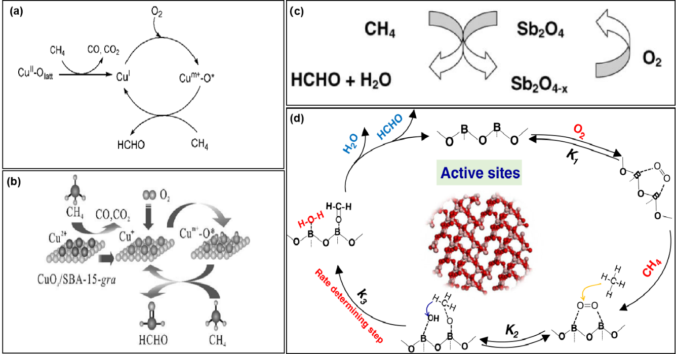图7 (a) CuOx/SBA-15催化剂上CH4选择性氧化成HCHO的反应机理[58]; (b) CuOx/SBA-15-gra(接枝法)催化剂选择性氧化CH4生成HCHO可能发生的反应机理[163]; (c) α-Sb2O4与Sb2O4-x之间的氧化还原循环[169]; (d) 甲烷在B2O3基催化剂上选择性氧化制甲醛的可行途径示意图[173]Fig.7 (a) Reaction mechanism for selective oxidation of CH4 to HCHO over the CuOx/SBA-15 catalyst[58]; (b) possible reaction mechanism for the selective oxidation of CH4 to HCHO over the CuOx/SBA-15-gra catalysts[163]; (c) catalytic cycle of selective oxidation[169]; (d) schematic diagram of the plausible pathway of partial oxidation of methane to formaldehyde on B2O3 catalysts[173] |