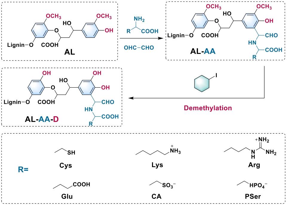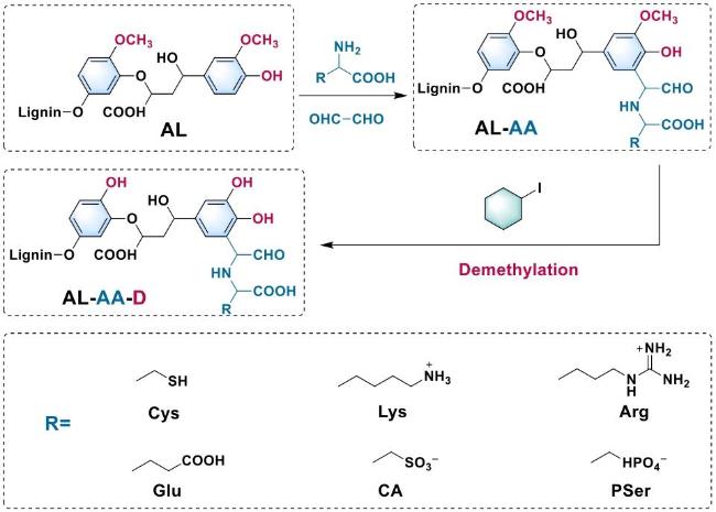 图1 氨基酸(AA)接枝结合脱甲基化修饰赋予碱木质素(AL)类贻贝黏附性,通过贻贝黏附蛋白中存在的离子-π/空间相关相互作用实现分子内协同作用[25]Fig.1 Amino acid (AA) grafting combining demethylating modification endows alkali lignin (AL) with mussel-like adhesion, realizing intramolecular synergy via ion-π/spatial correlation interactions existing in mussel adhesive proteins[25] |