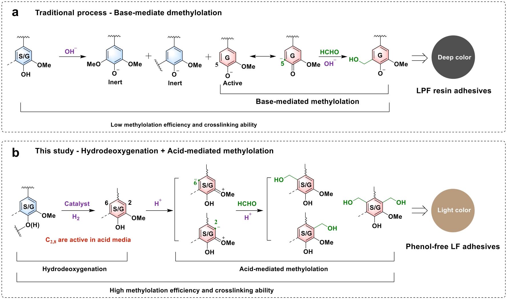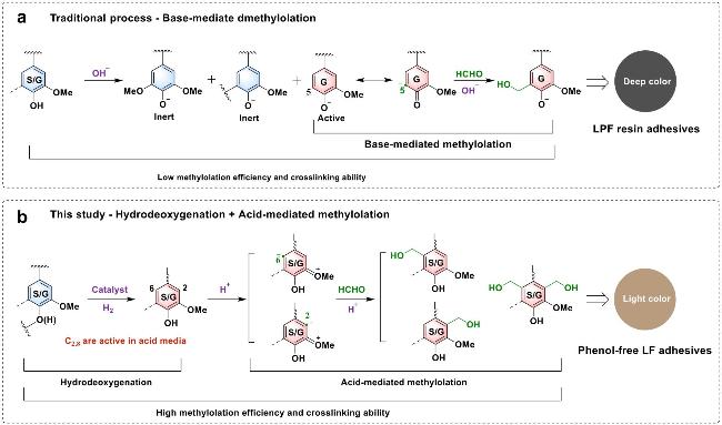 图3 (a) 合成木质素-酚-甲醛(LPF)树脂胶黏剂(木质素、苯酚和甲醛的水溶液)的传统工艺; (b) 无酚木质素-甲醛(LF)胶黏剂(木质素的水悬浮液)的合成工艺[28]Fig.3 (a) Traditional process for synthesis of lignin-phenol-formaldehyde (LPF) resin adhesives (an aqueous solution of lignin, phenol, and formaldehyde). (b) The proposed process for synthesis of phenol-free lignin-formaldehyde (LF) adhesives (an aqueous suspension of lignin) in this study[28] |
