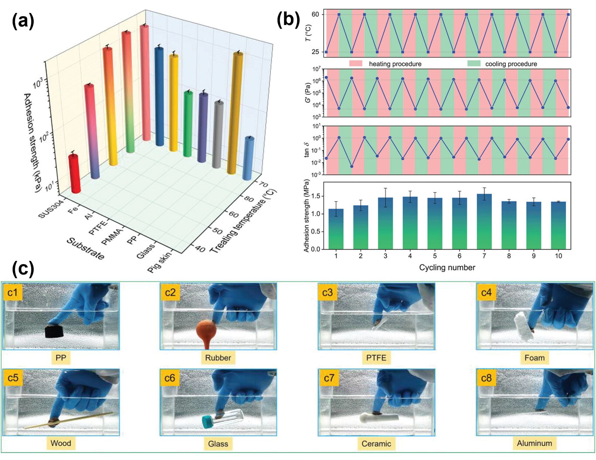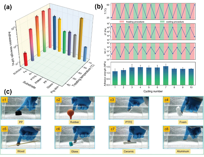 图6 (a) 不同温度下处理的GTA-h凝胶和GTA-h70凝胶在不同底物上的黏附强度; (b) GTA凝胶在25 °C和60 ℃的冷热循环试验中G′和tanδ的变化以及在10个重复循环中对应的水下黏附强度; (c) GTA-h60水凝胶在水下黏附不同材料的照片[33]Fig.6 (a) Adhesion strength of the GTA-h gel treated at different temperatures and the GTA-h70 gel on different substrates. (b) The change of G′ and tanδ of the GTA gel during the heating-cooling cyclic tests (25 °C and 60 °C) and the corresponding underwater adhesion strength during ten repeated cycles. (c) Photos of the GTA-h60 hydrogel underwater adhered with different materials[33] |