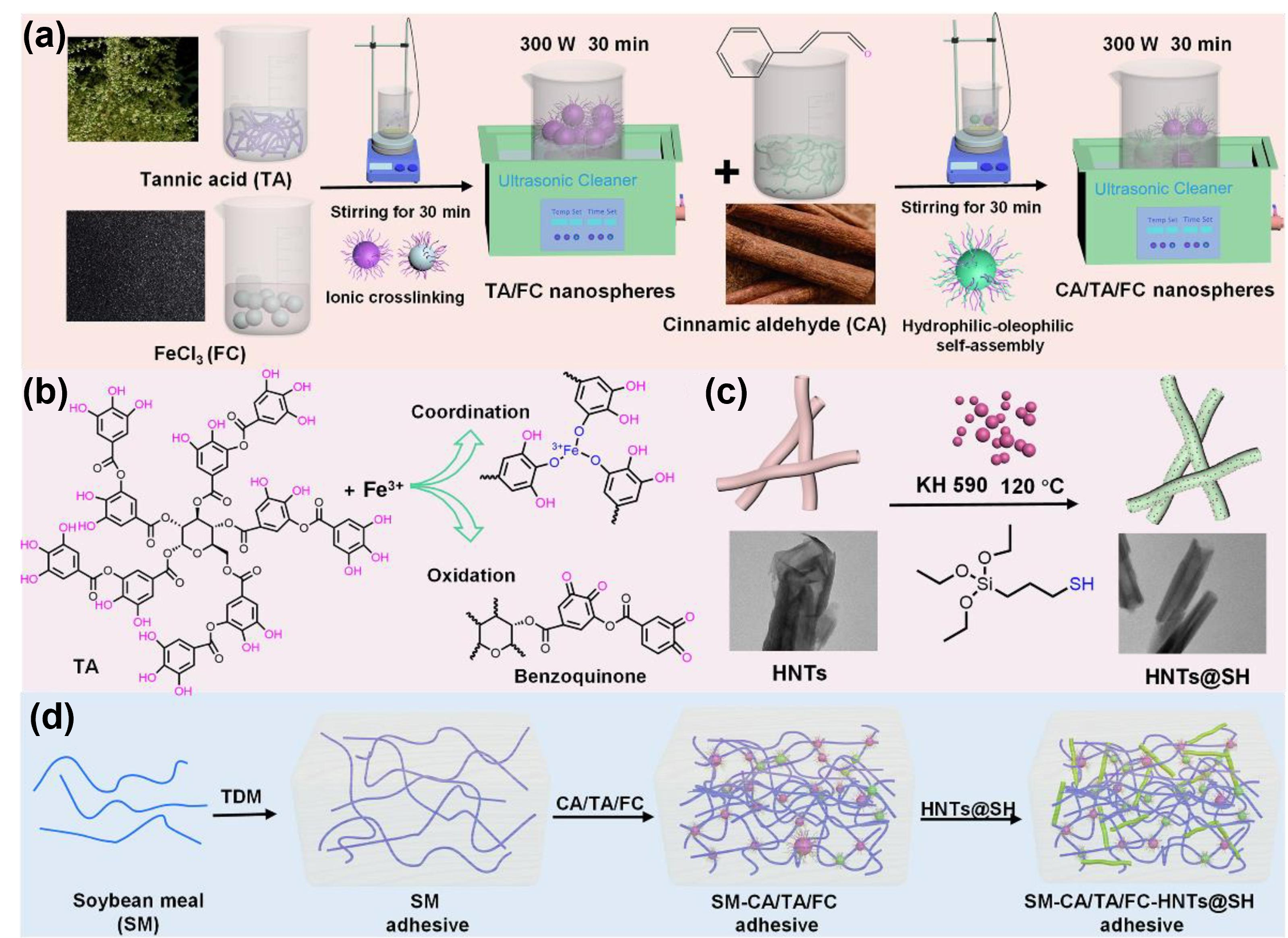 图7 (a) CA/TA/FC多功能纳米球的制备流程图; (b) TA与FC之间相互作用; (c) HNTs@SH制备示意图; (d) SM-CA/TA/FC-HNTs@SH制备流程图[36]Fig.7 (a) Flow diagram of CA/TA/FC multifunctional nanospheres preparation. (b) The interactions between TA and FC. (c) Schematic diagram of HNTs@SH preparation. (d) Flow diagram of SM-CA/TA/FC-HNTs@SH preparation[36] |