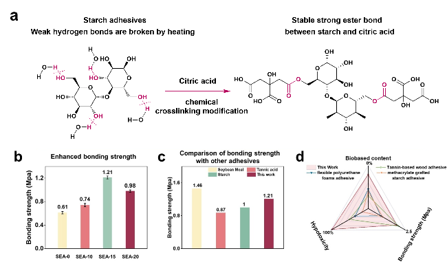 图5 (a) 用稳定的酯键取代弱氢键; (b) 化学交联淀粉胶黏剂的黏合强度直方图; (c) 比较不同胶黏剂黏合强度直方图; (d) 本研究使用生态胶黏剂与先前确定的胶黏剂检查胶合板的黏合强度、低毒性和生物质含量[31]Fig.5 (a) Replacement of weak hydrogen bonds by stable ester bonds; (b) The bonding strength histogram of chemical cross-linking starch adhesives; (c) Histogram comparing the adhesive strength of different adhesives; (d) This study examines the bonding strength, hypo toxicity, and biomass contents of plywood using ecological adhesives to previously identified adhesives[31] |