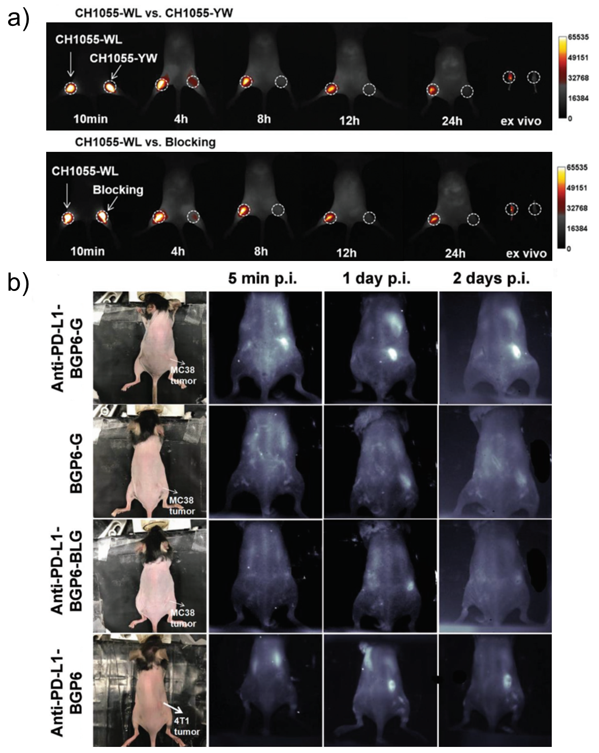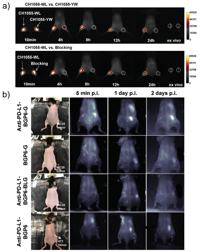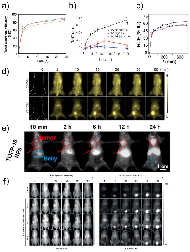 图6 (a) CDIR2肾脏清除率。 (b) TQFP-10肿瘤以及正常组织信号比。 (c) FBP912肾脏清除率。 (d) FBP912荧光成像。 (e) TQFP-10脑补肿瘤成像。 (f) CDIR2荧光成像[22-25]Fig.6 (a) CDIR2 renal clearance. (b) TQFP-10 tumor to normal tissue signal ratio. (c) FBP912 renal clearance. (d) FBP912 fluorescence imaging. (e) TQFP-10 imaging tumor imaging. (f) CDIR2 fluorescence imaging[22-25] |