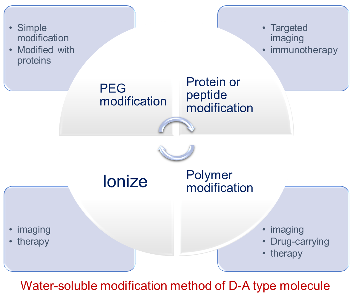D-A-D molecule refers to a class of conjugated structure molecules composed of an electron donor and an electron acceptor. The NIR two-region fluorescence imaging dominated by such molecules has the advantages of good penetration effect and high imaging clarity. It has high application potential in clinical diagnosis. However, such molecules usually contain conjugated benzene ring structures. This means that the water solubility of these molecules is not good, which greatly limits the wider application of NIR-Ⅱregion fluorescence imaging. In recent years, D-A-D molecules have usually been modified to improve their water solubility. This review introduces four methods to improve water solubility by end-modified hydrophilic polyethylene glycol, modified other hydrophilic polymer chains, modified by protein or peptide, and end-ionized modification. The design methods and related applications of water-soluble D-A-D molecules are introduced in detail. Finally, the further development of water-soluble D-A-D small molecules in the field of NIR-Ⅱ region fluorescence imaging is prospect.