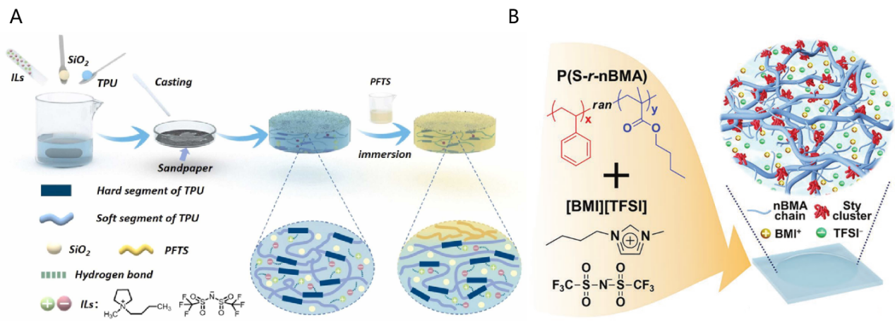 | In situ Polymerization | Use ILs as reaction media to directly construct cross-linked networks during monomer polymerization | Precise control of networks structures; strong interfacial bonding between ILs and polymers | High viscosity or chemical inhibition of ILs may lead to uneven polymerization; harsh reaction conditions | Systems with low-viscosity ILs and monomers capable of free-radical polymerization, or systems requiring in situ construction of multi/interpenetrating networks |