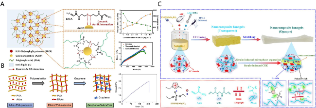 图9 (A) 自修复离子凝胶的结构及其力学性能示意图[77];(B) Gr-PAM/PVA离子凝胶的合成过程及力学性能示意图[78];(C) 纳米复合各向异性离子凝胶的制备示意图[81]Fig.9 (A) Structure and mechanical properties of self-healing ionic gel[77]; (B) synthesis process and mechanical properties of Gr-PAM/PVA ionogel[78]; (C) preparation of nanocomposite anisotropic ionogel[81] |