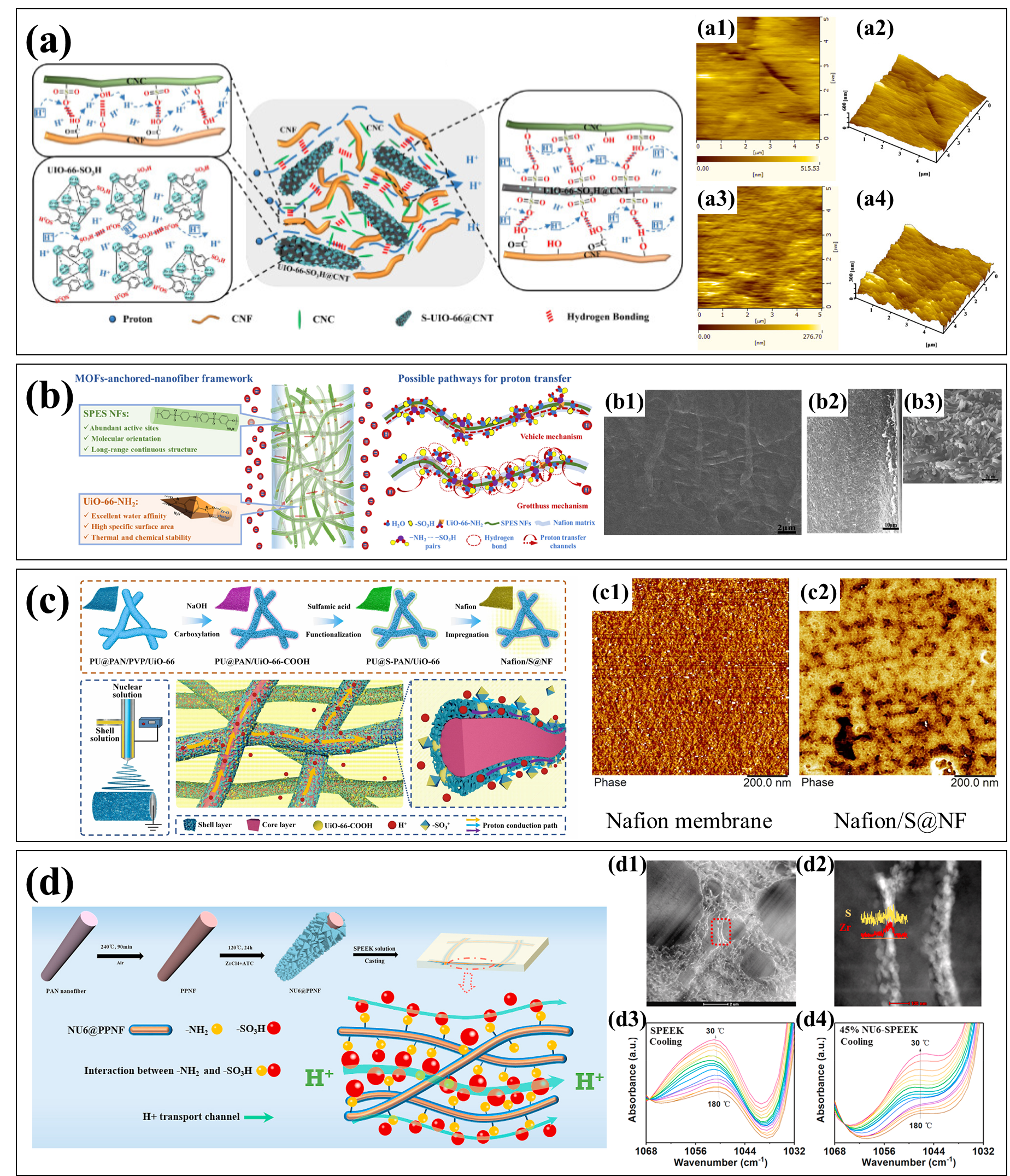 图12 (a) CC/S-UIO-66@CNT膜的质子传导机理和膜的AFM表面形貌,(a1, a2) CNF/CNC, (a3, a4) CC/S-UIO-66@CNT-5[97];(b) UiO-66-NH2@NFs复合膜的设计结构和可能存在的质子传输途径及其表面与截面SEM图像[99];(c) 同轴静电纺丝和制备工艺示意图与膜的AFM相图[101];(d) 膜制备过程和质子转移机制及(d1, d2) 1.3% NU6@PPNF-SPEEK的STEM-HAADF图和元素分析,(d3, d4)SPEEK和5% NU6-SPEEK的原位FTIR(从180 ℃冷却到30 ℃)[104]Fig.12 (a) Proton conduction mechanism of CC/S-UIO-66@CNT membranes and AFM surface topographies of (a1, a2) CNF/CNC, (a3, a4) CC/S-UIO-66@CNT-5[97]; (b) designed structure of UiO-66-NH2@NFs and possible routes for proton transfer in the hybrid membranes, as well as surface and cross-sectional SEM images[99]; (c) schematic diagram of the coaxial electrospinning and preparation process and AFM phase images of membranes[101]; (d) membrane preparation process and proton transfer mechanism, as well as (d1, d2) STEM-HAADF image and elemental analysis of 1.3% NU6@PPNF-SPEEK, (d3, d4) in-situ FTIR of SPEEK and 45% NU6-SPEEK (cooling process from 180 ℃ to 30 ℃)[104]. Ref. [97], Copyright 2025, American Chemical Society. Ref. [99], Copyright 2019, Elsevier. Ref. [101], Copyright 2024, Elsevier. Ref. [104], Copyright 2021, Elsevier |