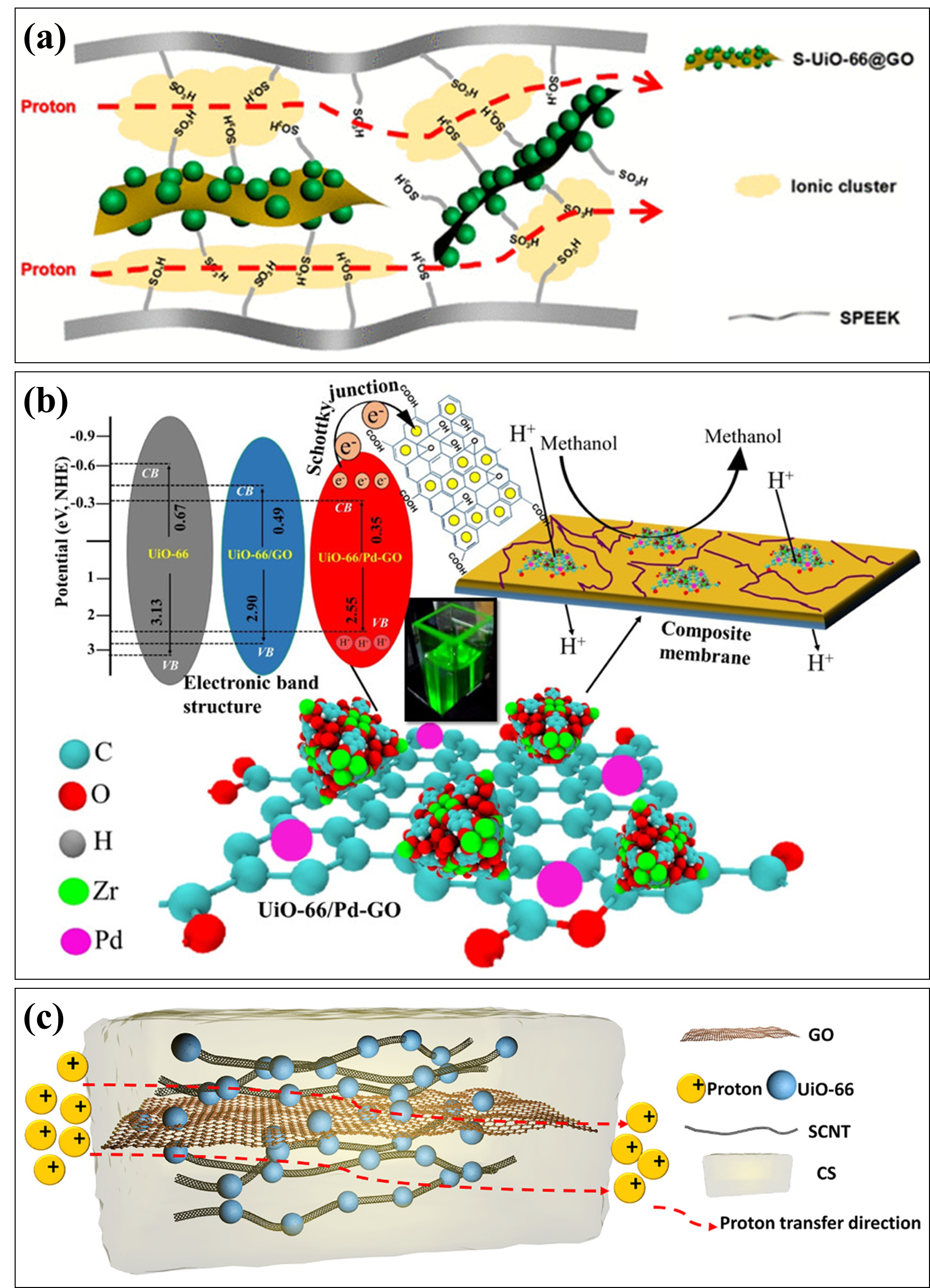 图13 (a) SPEEK/S-UiO-66@GO复合膜增强的传输特性[111];(b) UiO-66/Pd-GO和复合膜的结构示意图与填料的电子能带结构[113];(c) CS/U-S@GO膜质子传导机理[115]Fig.13 (a) Enhanced transport properties of SPEEK/S-UiO-66@GO composite membranes[111]; (b) schematic diagram of UiO-66/Pd-GO and composite membrane structure, as well as electronic band structure of fillers[113]; (c) proton transfer mechanism of CS/U-S@GO membrane[115]. Ref. [111], Copyright 2017, American Chemical Society. Ref. [113], Copyright 2021, American Chemical Society. Ref. [115], Copyright 2020, Wiley |