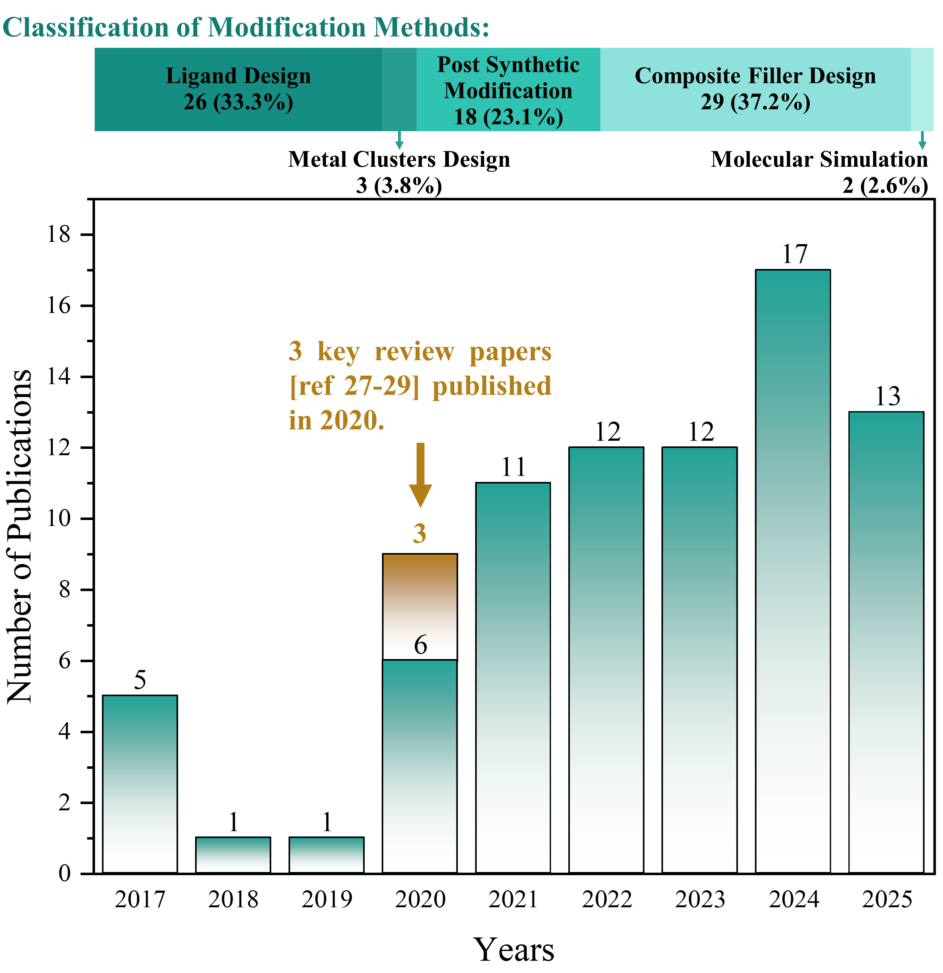 | Pre-synthetic modification (ligand functionalization or metal clusters modification) | For MOFs: √ One-step synthesis method. √ Modulation of metal ions or organic ligands allows for flexible and convenient regulation of the textural properties. √ Adjustable size and strong stability. √ Evenly distributed functional groups inside the crystal facilitate orderly and unobstructed internal channels. √ High functional group density modified upon pre-synthesis. √ Metal clusters: Zr: Low price. Ce: Functionalized in eliminating free radicals. Hf: High Hf-O bond energy. | For MOFs: × Low conductivity. × Difficult to adjust or replace functional groups modified before synthesis. × Metal clusters: Zr: slightly lowered Zr-O bond energy. Ce: slightly less stable and higher cost. Hf: highest cost. |