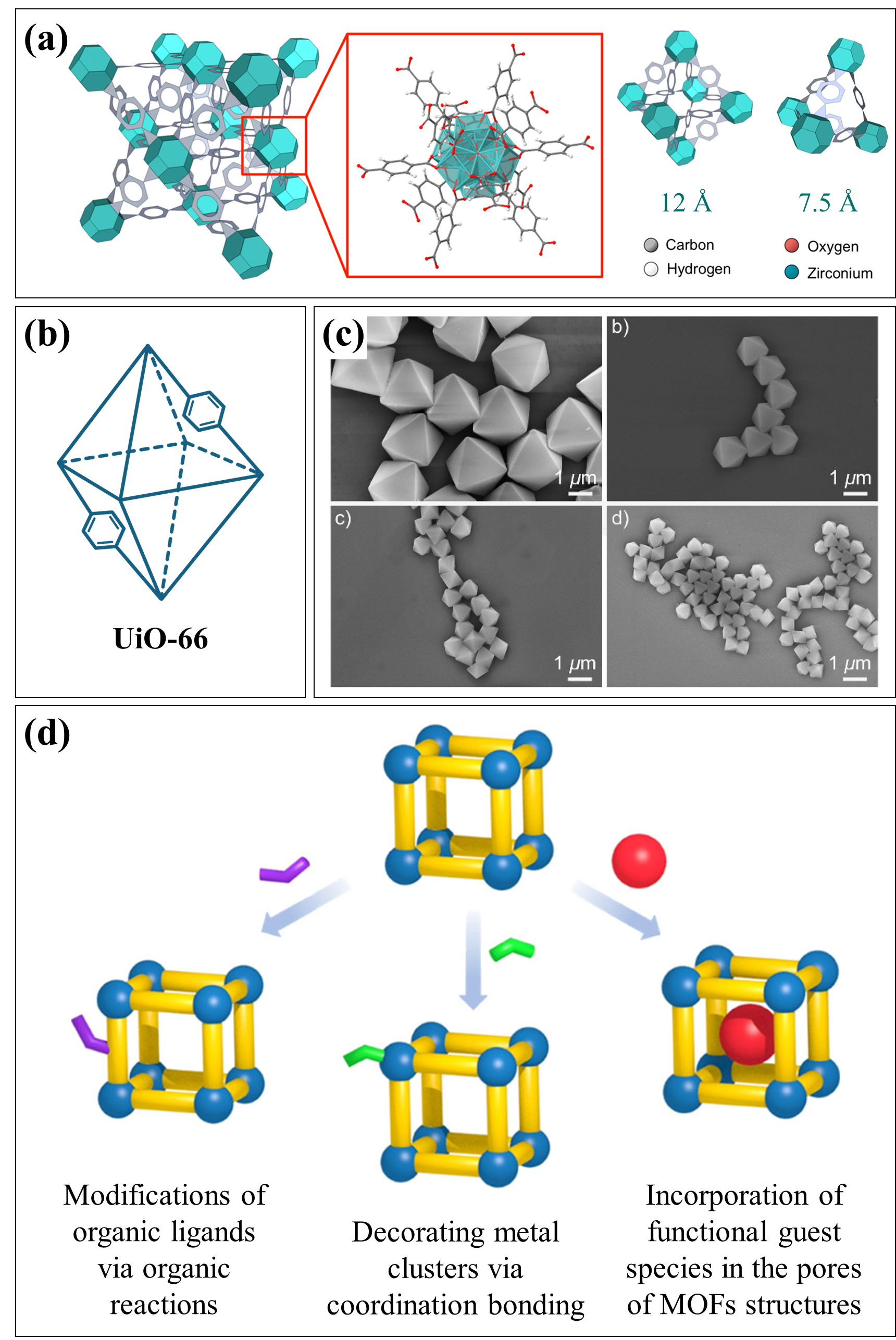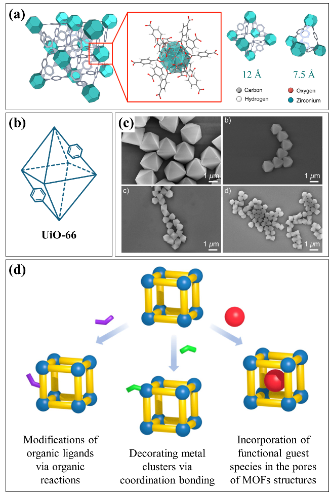 图2 (a) UiO-66结构以面心立方排列为特征,包括金属节点(浅绿色)和配体(灰色)。节点由与12个对苯二甲酸连接体连接的金属原子形成,形成两种笼状结构(12和7.5 Å)[32];(b) UiO-66简易图;(c) 不同晶体尺寸UiO-66的SEM图像[33];(d) MOFs功能化的不同策略示意图[37]Fig.2 (a) UiO-66 structure, characterized by a face-center-cubic arrangement, comprises metal nodes (aqua) and ligands (gray). The nodes are formed by metal atoms connected with 12 terepthalic acid linkers, resulting in two types of cage structures (12 and 7.5 Å)[32]; (b) schematic diagram of UiO-66; (c) SEM images of UiO-66 with different crystal sizes[33]; (d) schematic diagram of different strategies for the functionalization of MOFs[37]. Ref. [32] Copyright 2020 American Chemical Society. Ref. [33], Copyright 2017, American Chemical Society. Ref. [37], Copyright 2019, American Chemical Society |