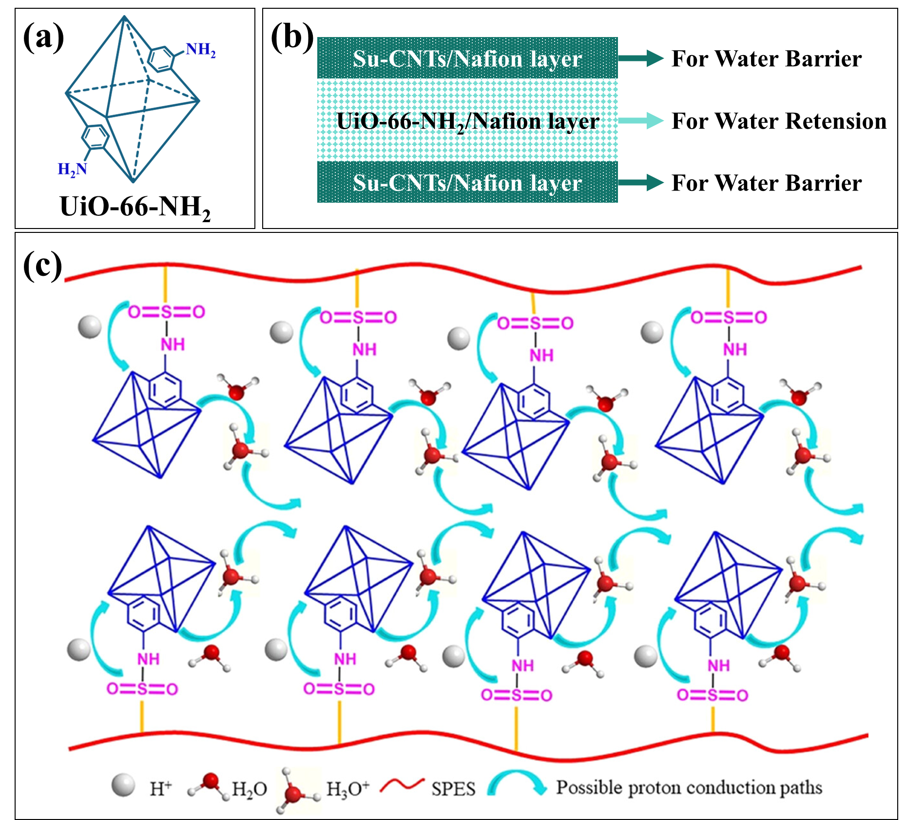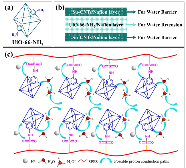 图6 (a) UiO-66-NH2简易图;(b) SUS三层膜结构示意图[64];(c) UiO-66-NH2-SPES复合膜的质子传导机理[66]Fig. 6 (a) Schematic diagram of UiO-66-NH2; (b) schematic of the SUS three-layer membrane structure[64]; (c) proton transfer mechanism of the UiO-66-NH2-SPES composite membrane[66]. Ref. [64], Copyright 2024, Elsevier. Ref. [66], Copyright 2023, American Chemical Society |
