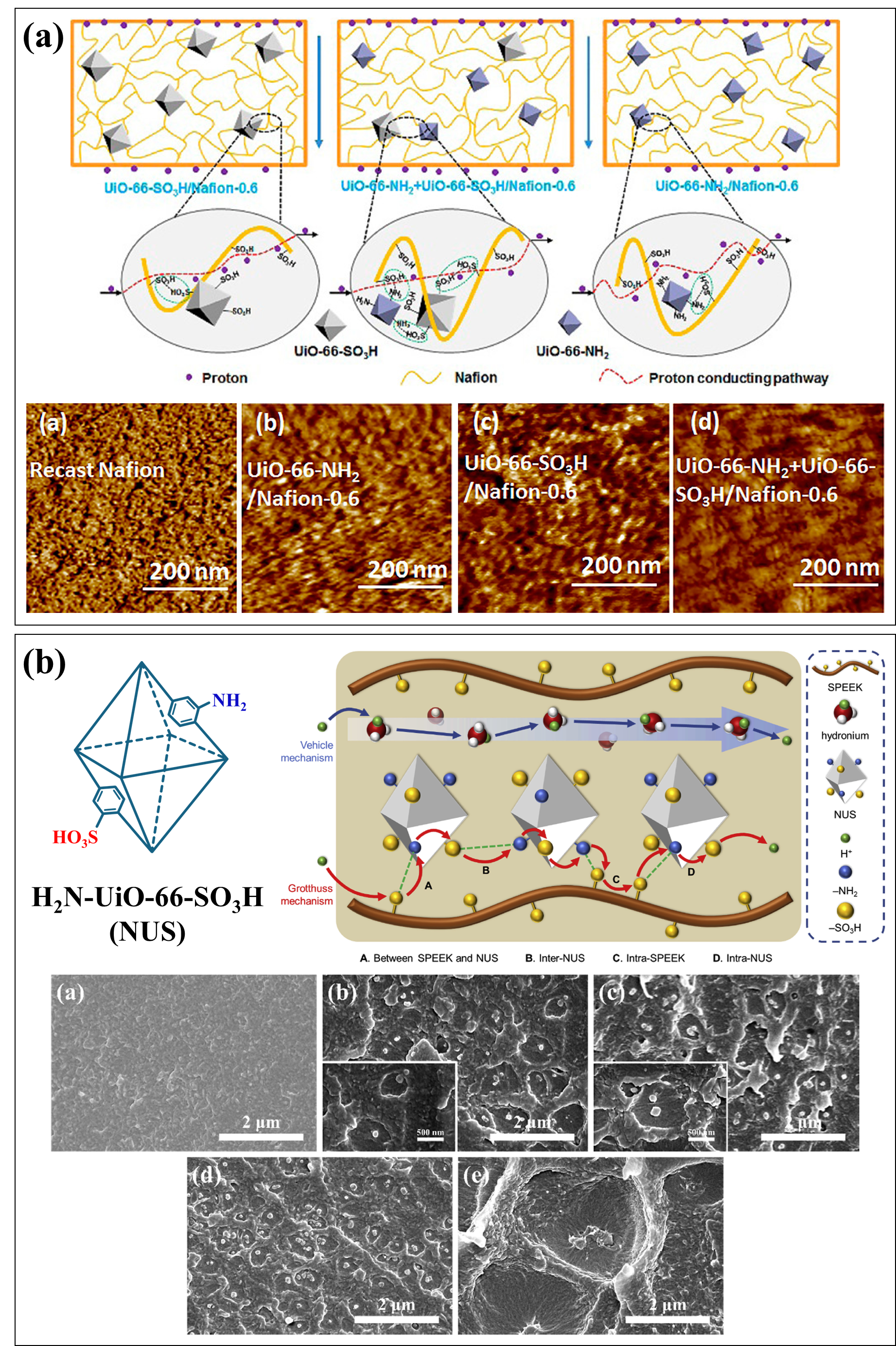 图7 (a) 复合膜内两类MOFs与聚合物三者之间的相互作用及膜的AFM相图[68];(b) NUS简易图和SPEEK/NUS-X复合膜中四类质子传输机理及膜截面SEM图[70]Fig.7 (a) The interactions among two types of MOFs and polymers within composite membranes and AFM phase diagram of membranes[68]; (b) schematic diagram of NUS as well as four types of proton transport mechanisms in SPEEK/NUS-X composite membranes and cross-sectional SEM images of membranes[70]. Ref. [68], Copyright 2017, American Chemical Society. Ref. [70], Copyright 2024, Elsevier |