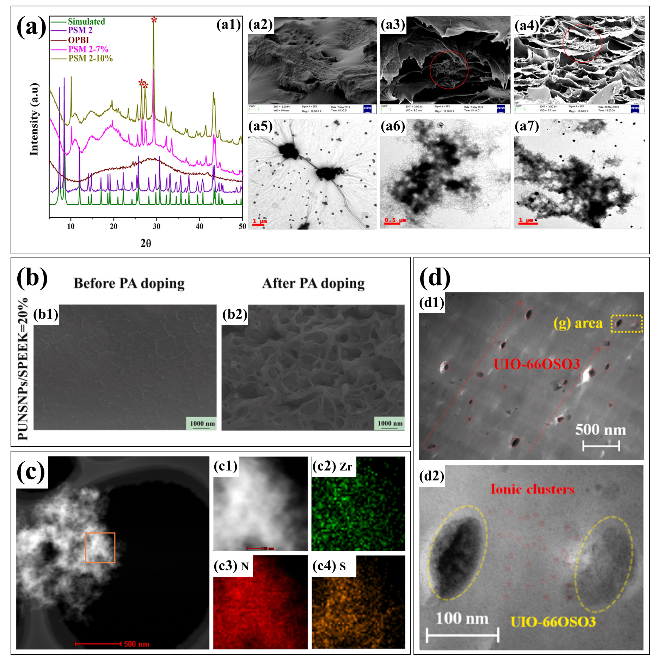 图10 (a) OPBI、PSM 2和纳米复合膜的XRD图(a1)及纯OPBI、PSM 1-10%和PSM 2-10%复合膜的SEM横截面图像(a2~a4),PSM 1-10% (a5)和PSM 2-10% (a6, a7)的TEM图像[79];(b) PUNSNPs/SPEEK=20%的截面SEM图[81];(c) SPEEK/UNC3S-3的STEM图像和SPEEK/NCC3S-3的高倍STEM-HAADF (c1)与元素分析(c2~c4)[82];(d) 染色PBIU-0.40 (d1)和UIO-66OSO3纳米颗粒之间密集离子簇(d2)的TEM图像[85]Fig. 10 (a) XRD patterns of OPBI, PSM 2 and nanocomposite membranes (a1), SEM cross-sectional images of pristine OPBI, PSM 1-10% and PSM 2-10% composite membranes (a2~a4), TEM images of PSM 1-10% (a5) and PSM 2-10% (a6, a7)[79]; (b) SEM cross-section images of PUNSNPs/SPEEK=20%[81]; (c) STEM image of SPEEK/UNC3S-3, high magnification STEM-HAADF (c1) and elemental analysis of SPEEK/UNC3S-3 (c2~c4)[82]; (d) TEM image of stained PBIU-0.40 (d1) and densely ionic clusters between UIO-66OSO3 nanoparticles (d2)[85]. Ref. [79], Copyright 2020, American Chemical Society. Ref. [81], Copyright 2023, Elsevier. Refs. [82,85], Copyright 2022, Elsevier |