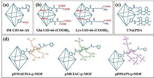 图11 各类碱性基团协同修饰的UiO-MOFs结构简图:(a) 咪唑基团修饰的UiO-66[89-91];(b) 氨基酸官能化的Glu-UiO-66-(COOH)2和Lys-UiO-66-(COOH)2[93];(c) UN@PDA[94];(d) 聚合物刷修饰的MOFs[95]Fig.11 Schematic diagram of UiO-MOFs co-modified by alkaline synergistic modification. (a) UiO-66 modified with imidazole groups[89-91]; (b) amino acid-functionalized Glu-UiO-66-(COOH)2 and Lys-UiO-66-(COOH)2[93]; (c) UN@PDA[94]; (d) polymer brush modified MOFs[95] |