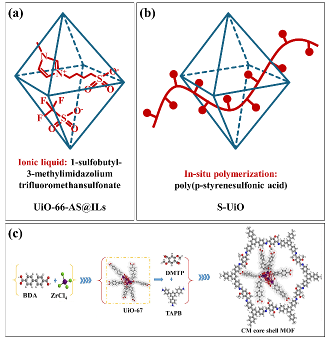 | Post-synthetic modification (grafting acidic or alkaline functional groups) | For MOFs: √ External crystal modification to preserve the complete skeleton. √ Flexible design. √ High conductivity. | For MOFs: × Complex synthesis and lower yields. × Synthesis conditions may damage the crystal structure. × Uneven distribution of functional groups or local overload. × Low functional group density modified upon post-synthesis. |