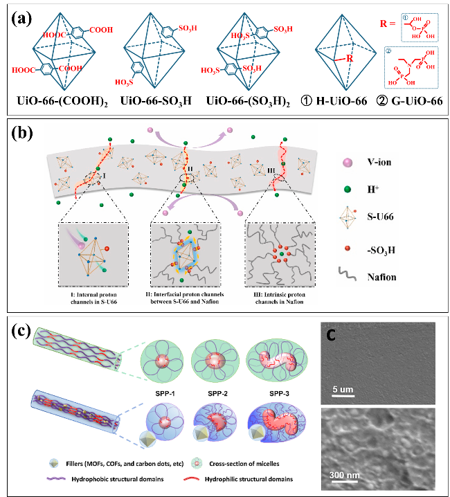 图5 (a) 酸性基团改性UiO-MOFs简易图[54-57];(b) 嵌入Nafion基质中的S-U66和杂化膜中三种类型的质子传输通道的示意图[56];(c) 微嵌段聚合物链结构和胶束示意图及USO-15 wt%@SPP-3膜截面SEM图[59]Fig.5 (a) Schematic diagram of acidic group modified UiO-MOFs[54-57]; (b) schematic illustration of S-U66 embedded in Nafion matrix and three types of proton transport channels in hybrid membranes[56]; (c) schematic diagram of microblock polymer chain structures and micelles, along with SEM images of USO-15 wt%@SPP-3 membrane cross-sections[59]. Ref. [56], Copyright 2021, Elsevier. Ref. [59], Copyright 2025, Elsevier |