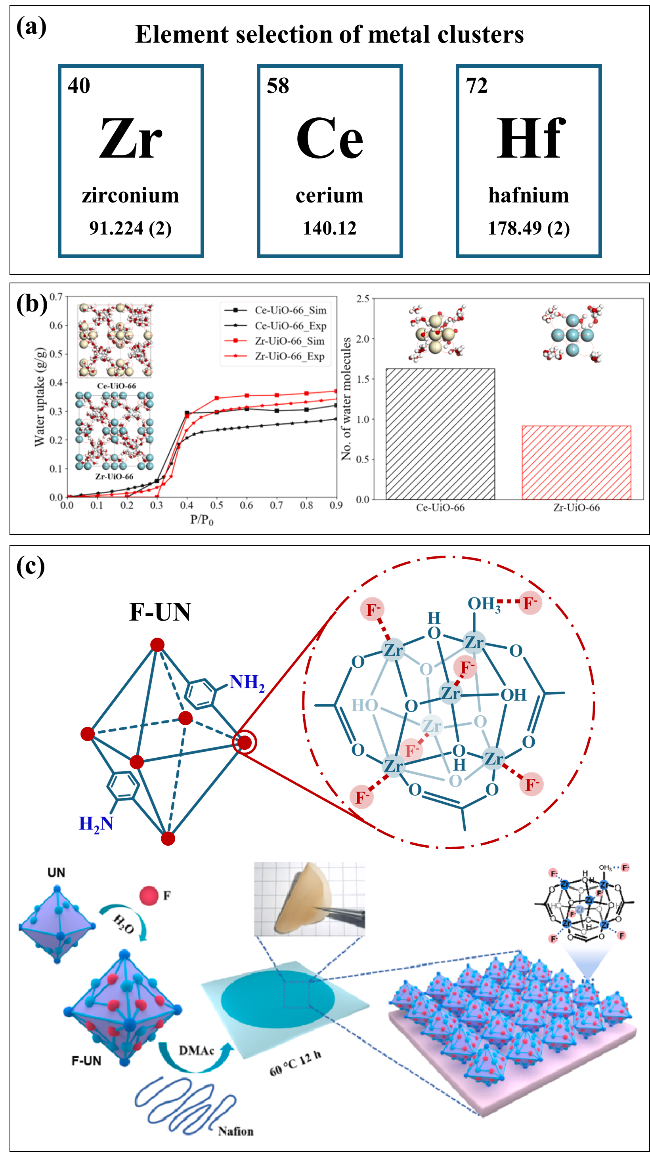 图8 (a) 金属中心的元素选择;(b) 不同金属中心UiO-66的水吸附等温线和瞬态图及金属附近水分子的数量和瞬态图[76];(c) 金属中心的氟化改性与制备UN-X%或F-UN-X%@Nafion的流程图[78]Fig.8 (a) Element selection of metal clusters; (b) water adsorption isotherm and snapshots, as well as number and snapshots of water molecules near metal of UiO-66[76]; (c) fluorination modification of metal clusters and flow diagram for preparing UN-X% or F-UN-X%@Nafion[78]. Ref. [76], Copyright 2023, Elsevier. Ref. [78], Copyright 2021, Elsevier |