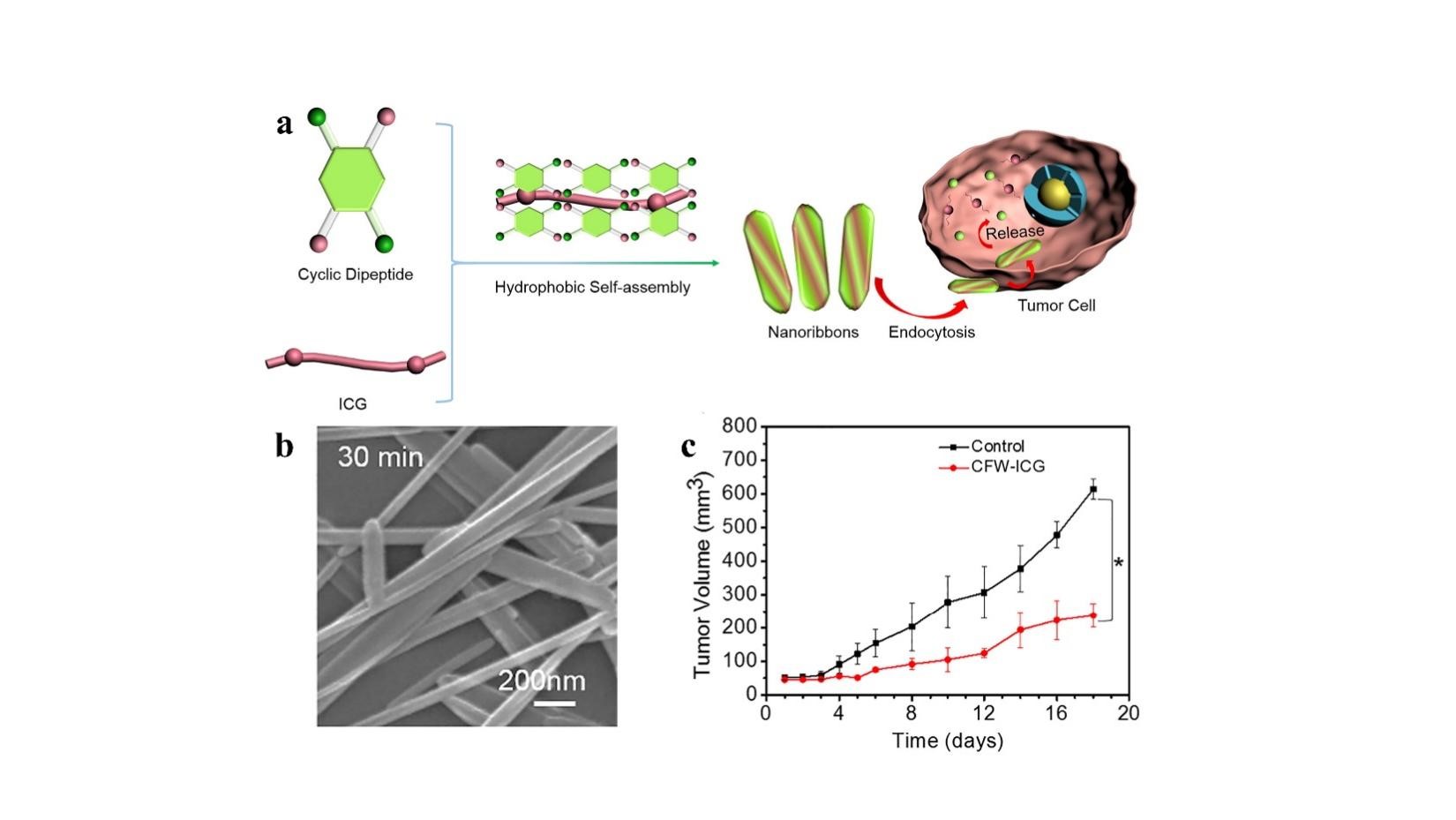 图7 纳米带的自组装和抗肿瘤研究[47]:(a) 环二肽和染料自组装纳米带的示意图及其在癌症化疗中的应用;(b) 环-Phe-Trp自组装形成刚性纳米纤维;(c) 18天内肿瘤生长趋势Fig.7 Self-assembly of nanoribbons and anti-tumour studies[47]. (a) Schematic representation of cyclic dipeptide and dye self-assembled nanoribbons and their application in cancer chemotherapy; (b) cyclo-Phe-Trp self-assembly to form rigid nanofibers; (c) tumour growth trend for 18 d |