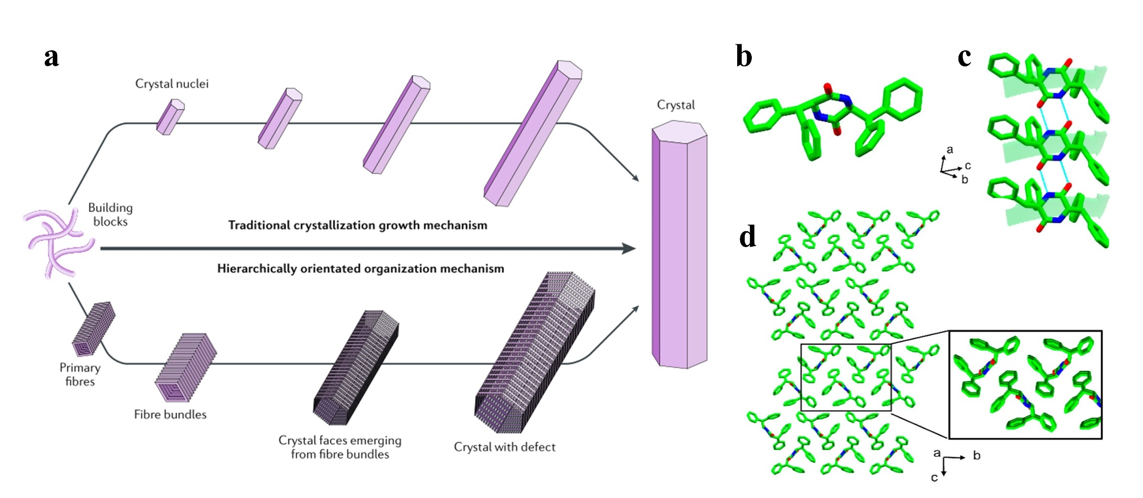 图1 结晶机制。(a) 传统晶体生长机理与分层组织机理的示意比较[6];(b) 环-Dip-Dip的晶体结构[16];(c) 环-Dip-Dip的β-片状结构[16];(d) 环-Dip-Dip的分子堆叠,插图为放大的拉链式区域[16]Fig.1 Crystallisation mechanisms. (a) Schematic comparison of conventional crystalline growth mechanism and hierarchical organisation mechanism[6]; (b) Crystal structure of cyclo-Dip-Dip[16]; (c) β-sheet structure of cyclo-Dip-Dip[16]; (d) molecular stacking of cyclo-Dip-Dip, inset shows enlarged zipper region[16] |