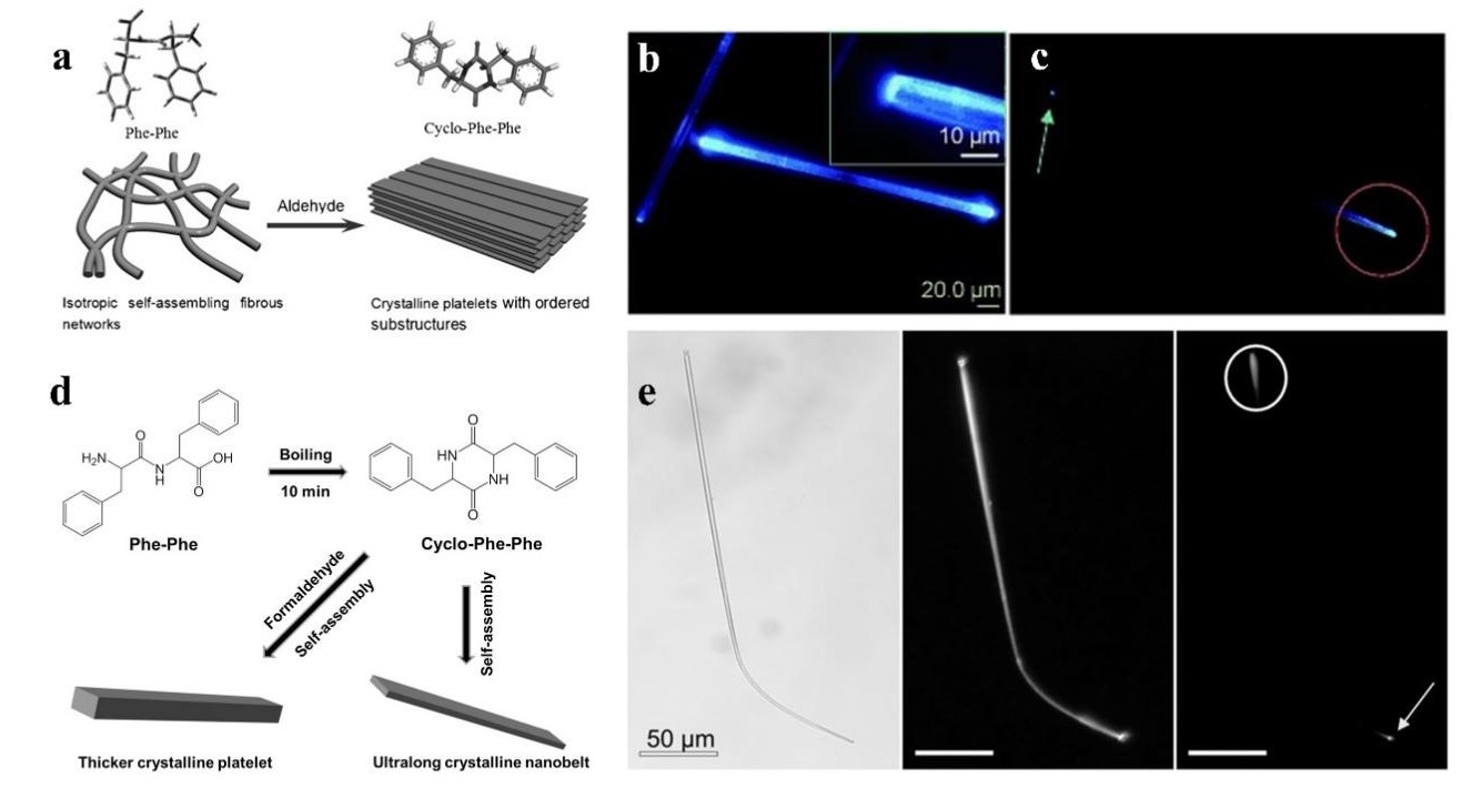 图3 环-Phe-Phe的光波导: (a) 定向结晶示意图[12];(b)和(c)单层片的光致发光图像,插图为一端放大的光致发光图像[12];(d) Phe-Phe中的环化过程和超长结晶纳米带的形成示意图[34];(e) 带有弯曲纳米带的光波导[34]Fig.3 Optical waveguiding of cyclo-Phe-Phe. (a) Schematic diagram of oriented crystallization[12], (b) and (c) Photoluminescence image of a single platelet, inset is a magnified PL image at one end[12]. (d) Schematic representation of the cyclisation process and the formation of ultra-long crystalline nanobelts in Phe-Phe[34]. (e) Optical waveguide with curved platelets[34] |