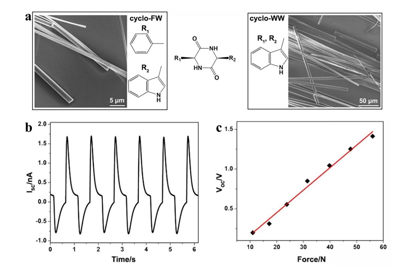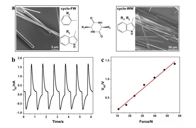 图4 环二肽的晶体结构和压电性[14]:(a) 环-Phe-Trp和环-Trp-Trp的分子结构和晶体形态;(b) 发电机的短路电流曲线;(c) 开路电压与力的线性关系Fig.4 Crystal structure and piezoelectricity of cyclic dipeptides[14]. (a) Molecular structure and crystal morphology of cyclo-Phe-Trp and cyclo-Trp-Trp. (b) Short-current curves of a generator. (c) Linear relationship between open-circuit voltage and applied force |