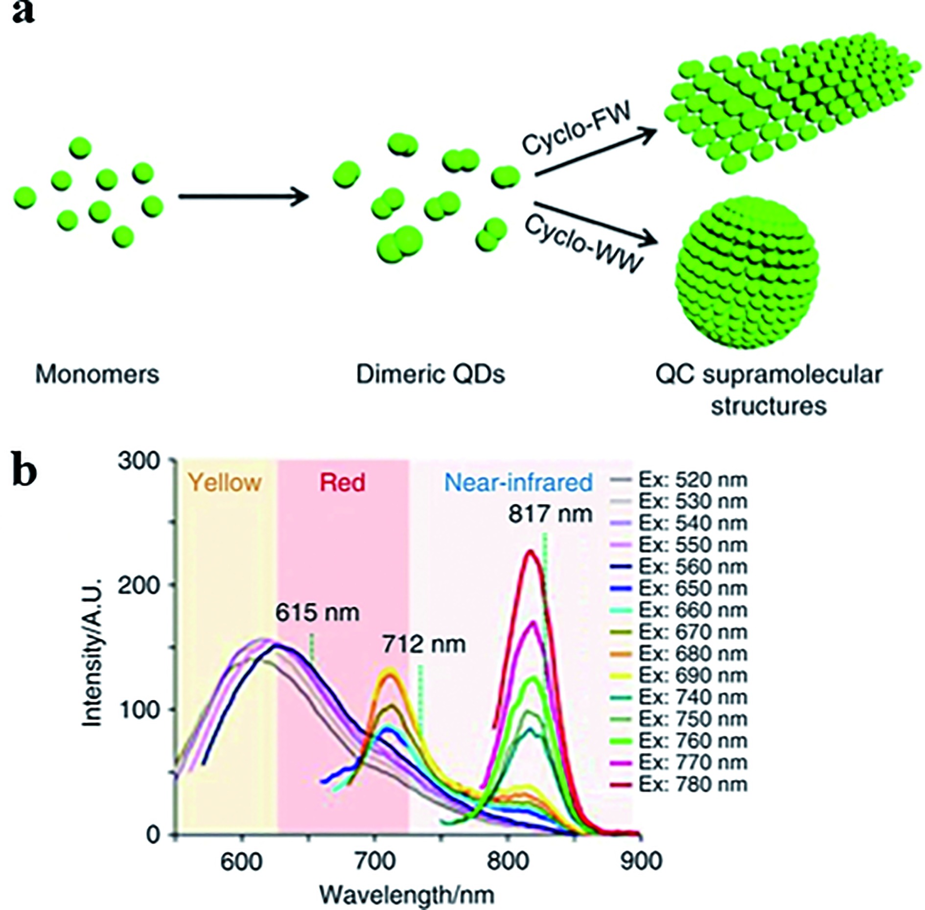 图6 环二肽的自组装过程和荧光特性[40]:(a) 环二肽自组装过程示意图;(b) 环-Trp-Trp + Zn(II)纳米球在DMSO中的荧光特性Fig.6 Self-assembly process and fluorescence properties of cyclic dipeptides[40]. (a) Schematic representation of the self-assembly process of cyclic dipeptides. (b) Fluorescence properties of cyclo-Trp-Trp + Zn(II) nanospheres in DMSO |