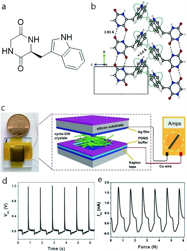 图5 环-Gly-Trp的分子堆积和压电性[15]:(a) 环-Gly-Trp的分子结构;(b) bc平面的超分子堆积;(c) 用于制备环-Gly-Trp晶体的发电机示意图;(d) 发电机的开路电压和(e) 短路电流Fig.5 Molecular packing and piezoelectricity of cyclo-Gly-Trp[15]. (a) Molecular structure of cyclo-Gly-Trp. (b) Supramolecular packing in the bc planes. (c) Schematic diagram of a generator for the preparation of cyclo-Gly-Trp crystal. (d) Open-circuit voltage and (e) short-circuit current of generator |