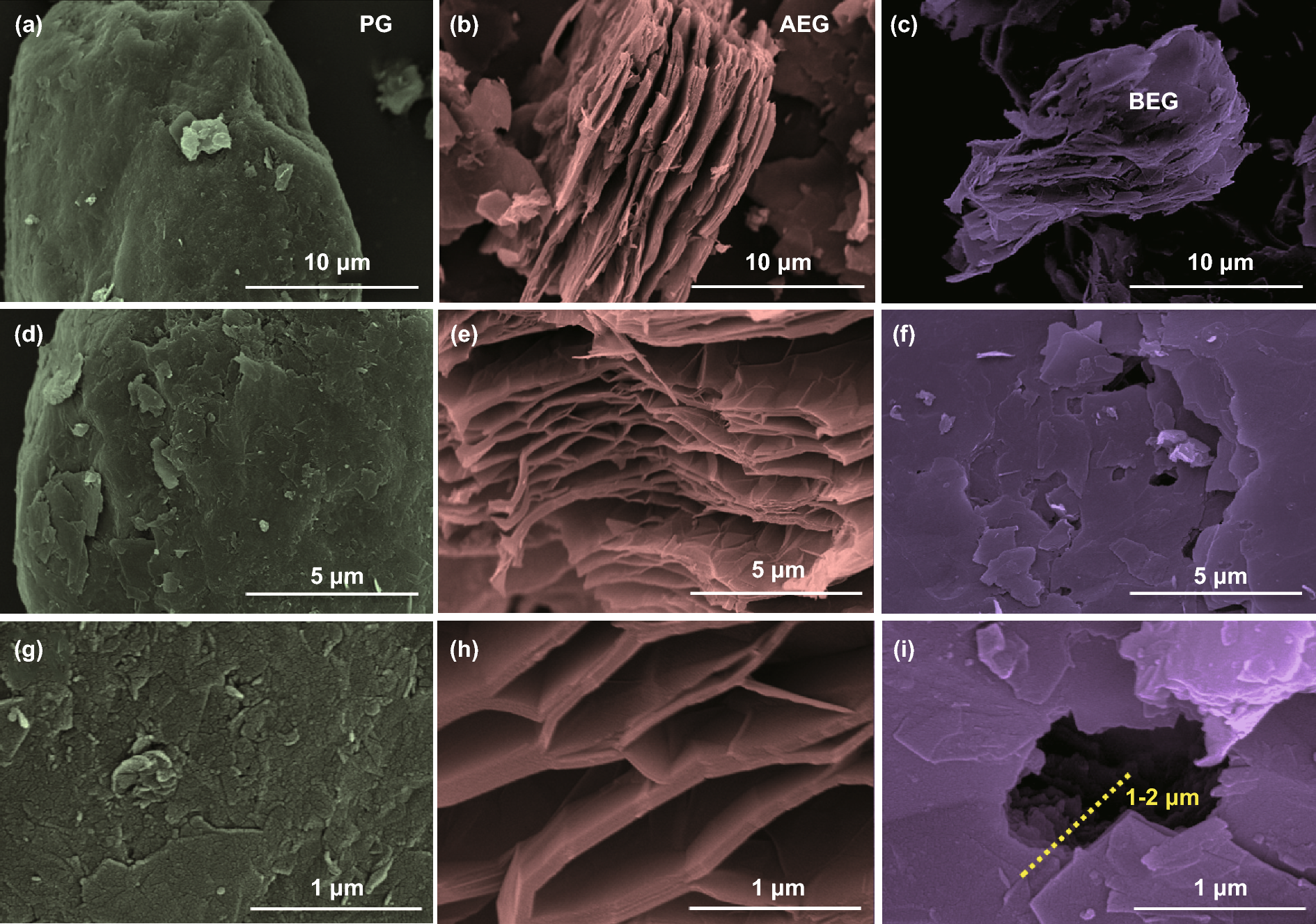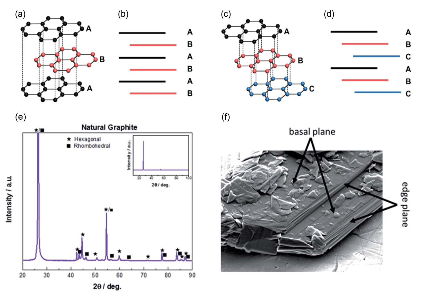 图1 (a) 六方石墨结构示意图;(b) 六方石墨基面和边缘面示意图;(c) 三方石墨结构示意图; (d) 三方石墨基面和边缘面示意图[14];(e) 天然石墨的XRD谱图;(f) 石墨的SEM图[15]Fig.1 (a) Illustration of hexagonal graphite structure; (b) illustration of the basal and edge plane surfaces of hexagonal graphite; (c) illustration of rhombohedral graphite structure; (d) illustration of the basal and edge plane surfaces of rhombohedral graphite; Reproduced with permission[14]. Copyright 2023, Royal Society of Chemistry. (e) XRD patterns of natural graphite; (f) SEM image of graphite. Reproduced with permission[15]. Copyright 2020, Royal Society of Chemistry |